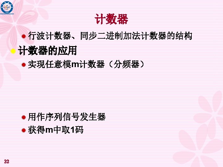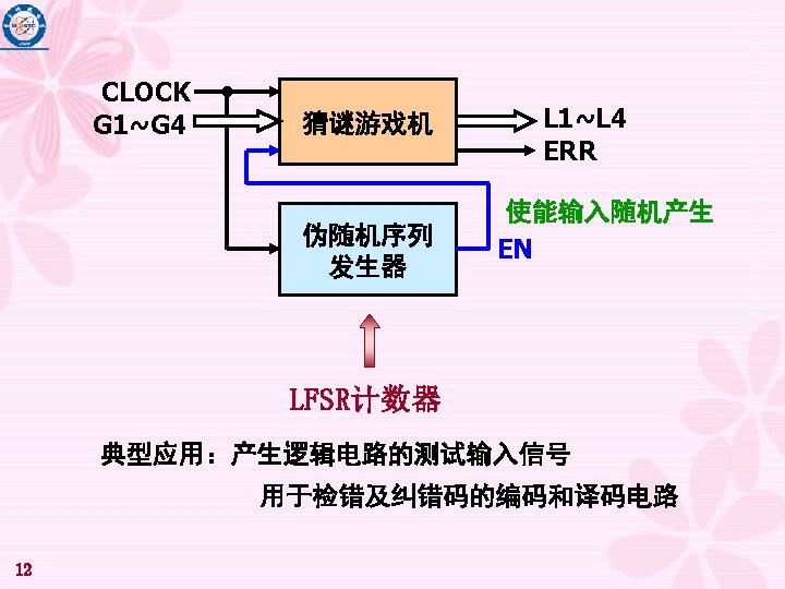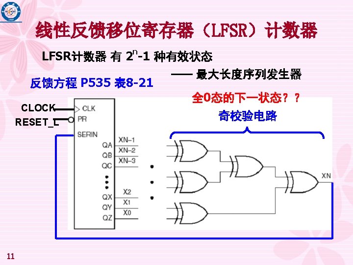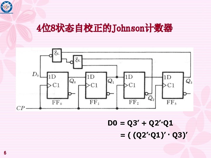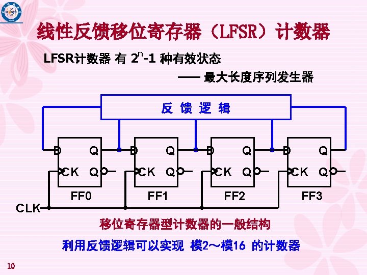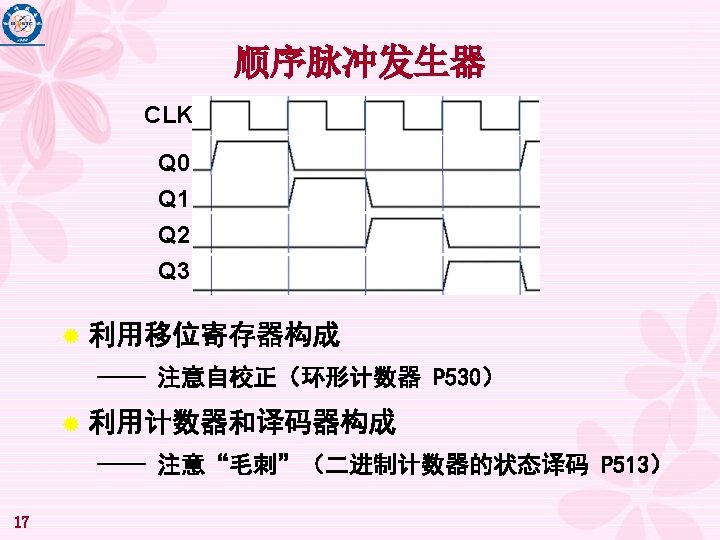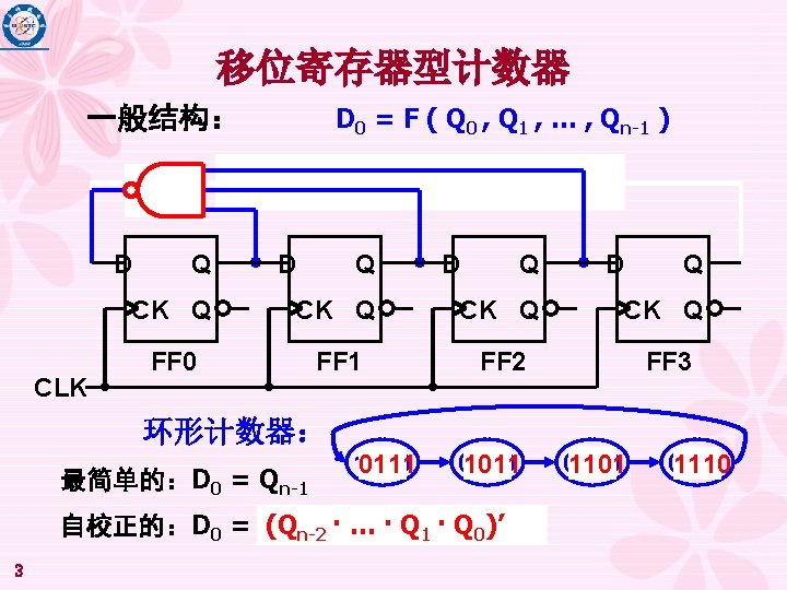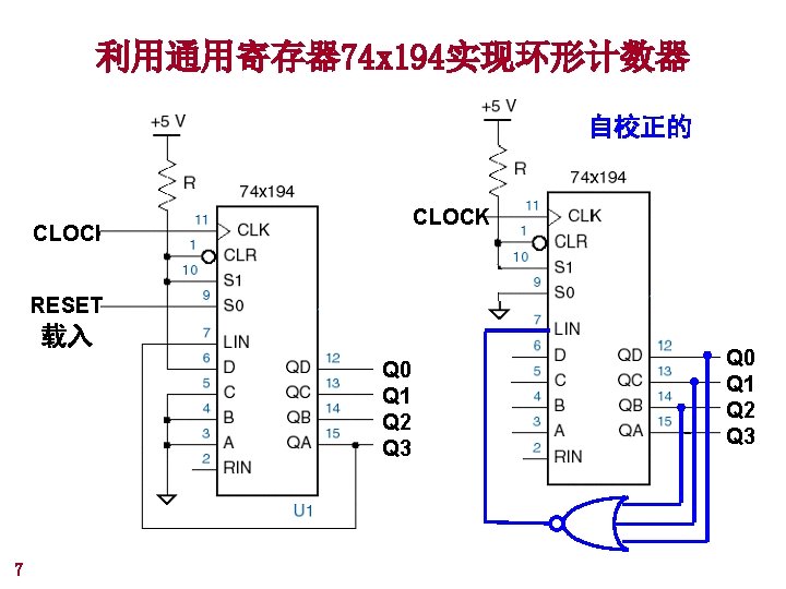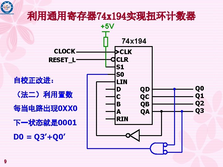 利用通用寄存器 74 x 194实现扭环计数器 +5 V 74 x 194 CLOCK RESET_L S 1 S 0接成左移形式 自校正改进: (法一) D 0 = Q 3’ + Q 2’·Q 1 8 CLK CLR S 1 S 0 LIN D C B A RIN QD QC QB QA Q 0 Q 1 Q 2 Q 3