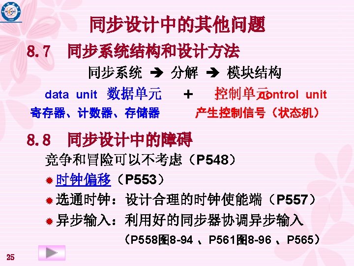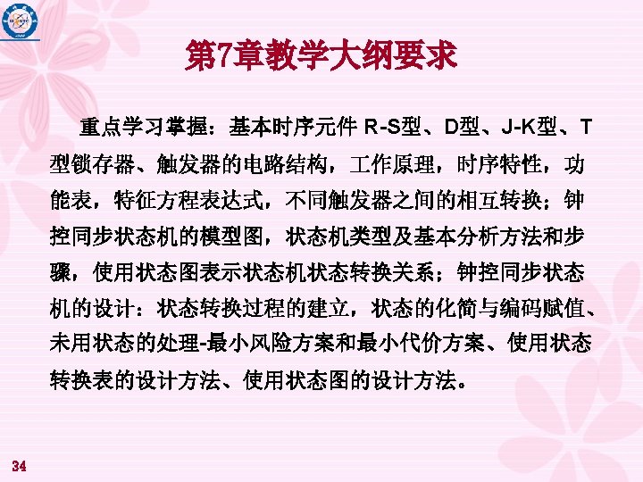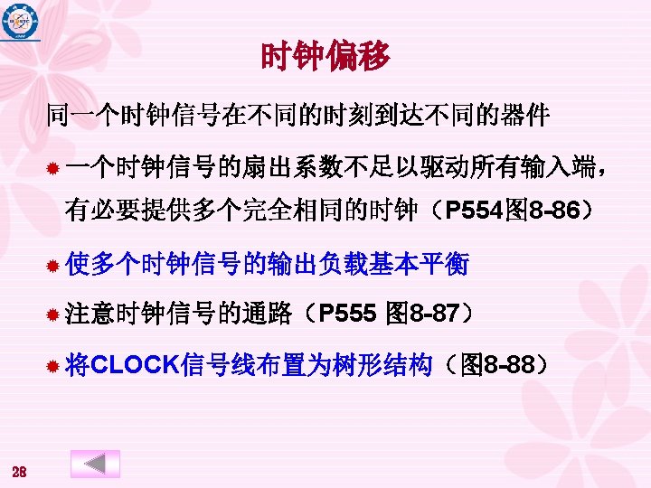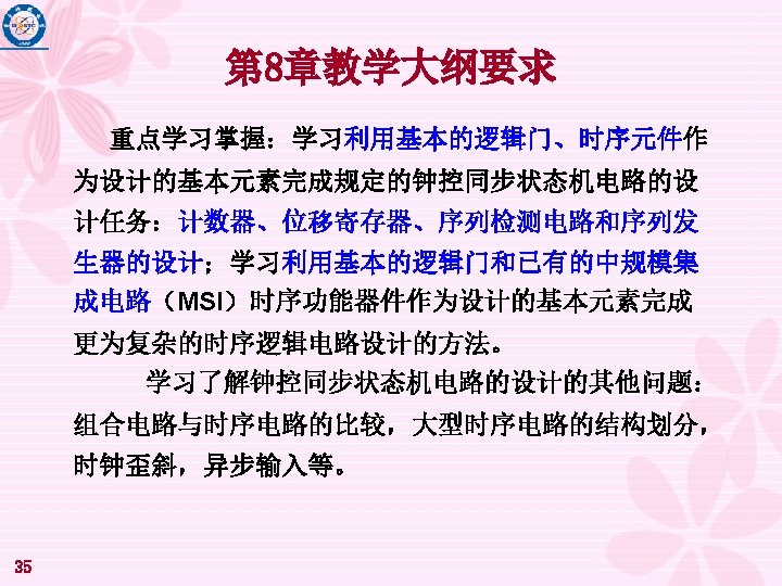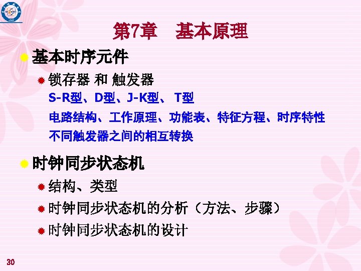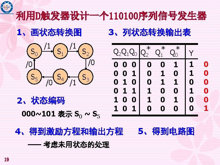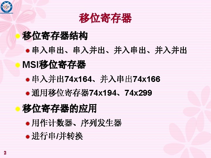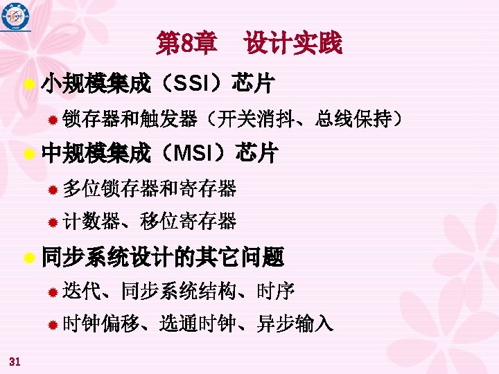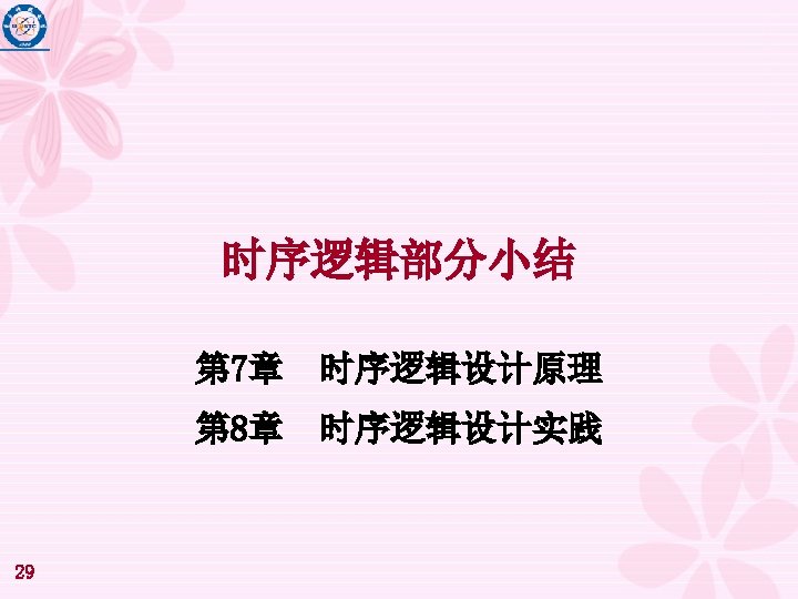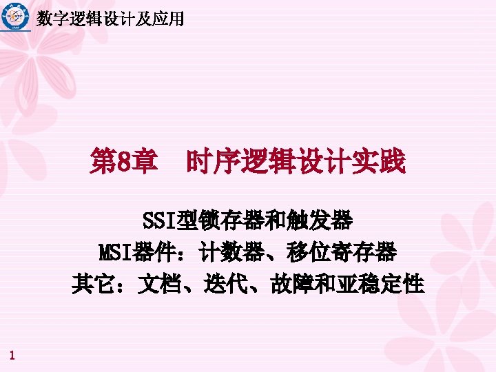 利用通用寄存器 74 x 194实现扭环计数器 +5 V 74 x 194 CLOCK RESET_L S 1 S 0接成左移形式 自校正改进: (法一) D 0 = Q 3’ + Q 2’·Q 1 8 CLK CLR S 1 S 0 LIN D C B A RIN QD QC QB QA Q 0 Q 1 Q 2 Q 3
