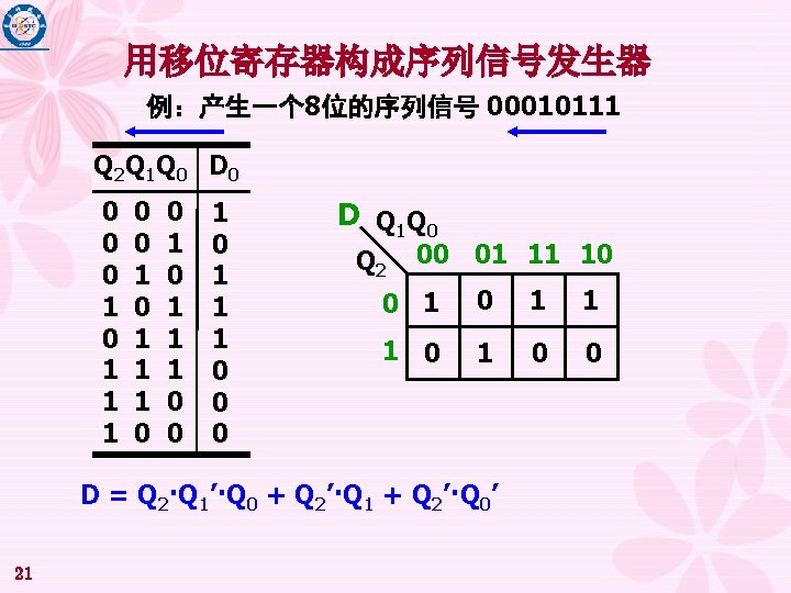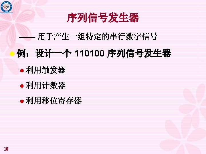 用计数器和数据选择器构成序列信号发生器 例:产生一个 8位的序列信号 00010111 74 x 163 +5 V 20 CLK CLR LD ENP ENT A B C D 74 x 151 EN A B C QA QB QC QD RCO +5 V D 0 D 1 D 2 D 3 D 4 D 5 D 6 D 7 Y Y 序列 信号 输出