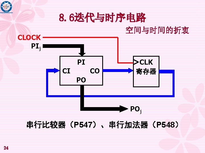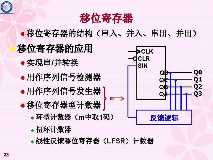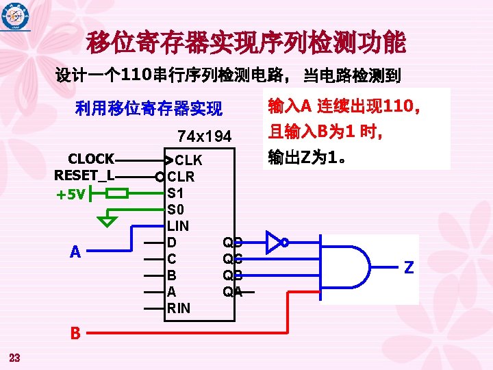 用移位寄存器构成序列信号发生器 例:产生一个 8位的序列信号 00010111 Q 2 Q 1 Q 0 D 0 0 1 0 1 1 1 0 0 0 74 x 194 CLOCK RESET_L +5 V D = Q 2·Q 1’·Q 0 + Q 2’·Q 1 + Q 2’·Q 0’ 22 CLK CLR S 1 S 0 LIN D C B A RIN QD QC QB QA 组合逻辑 Q 0 Q 1 Q 2 Q 3