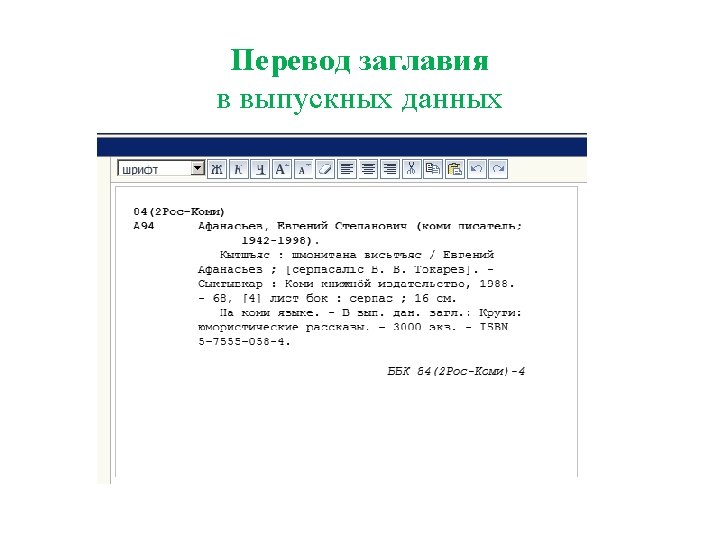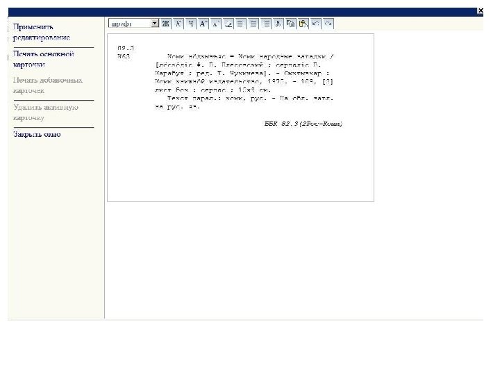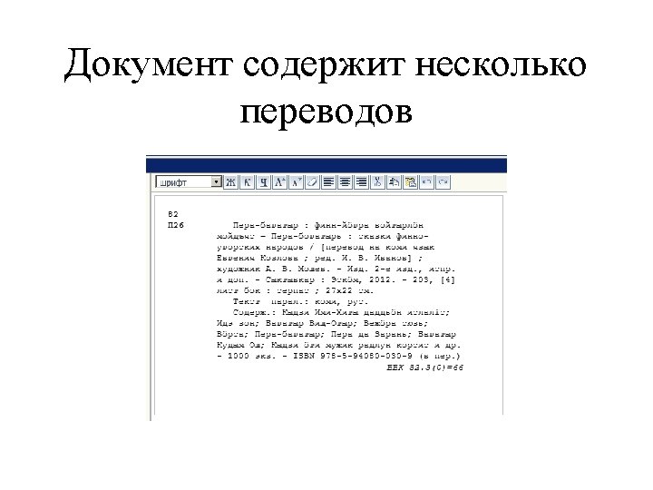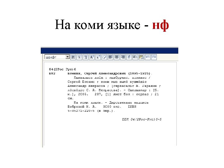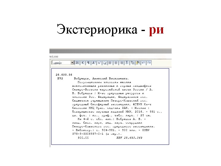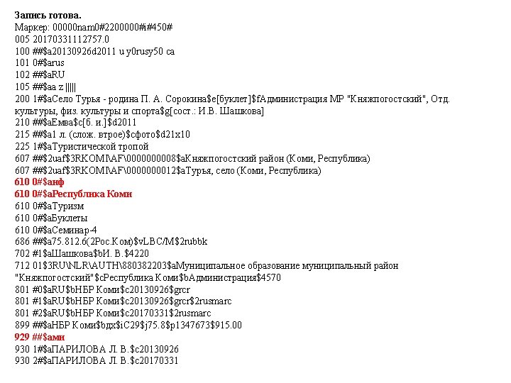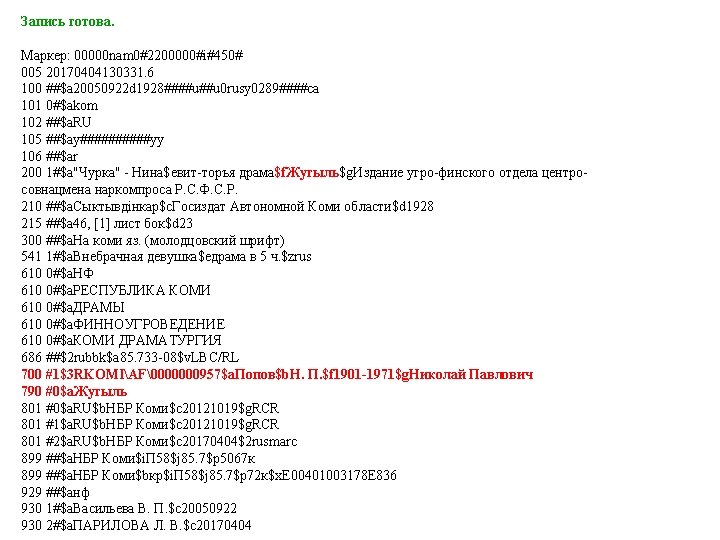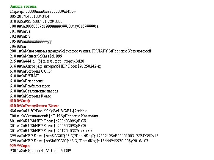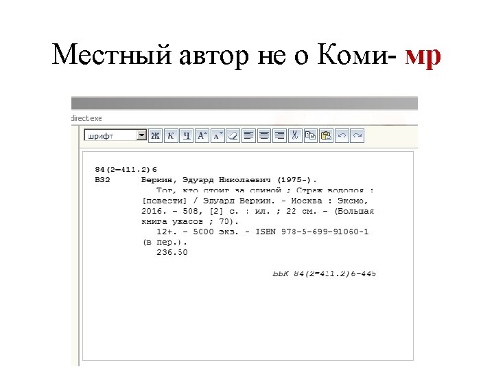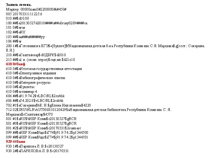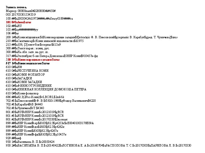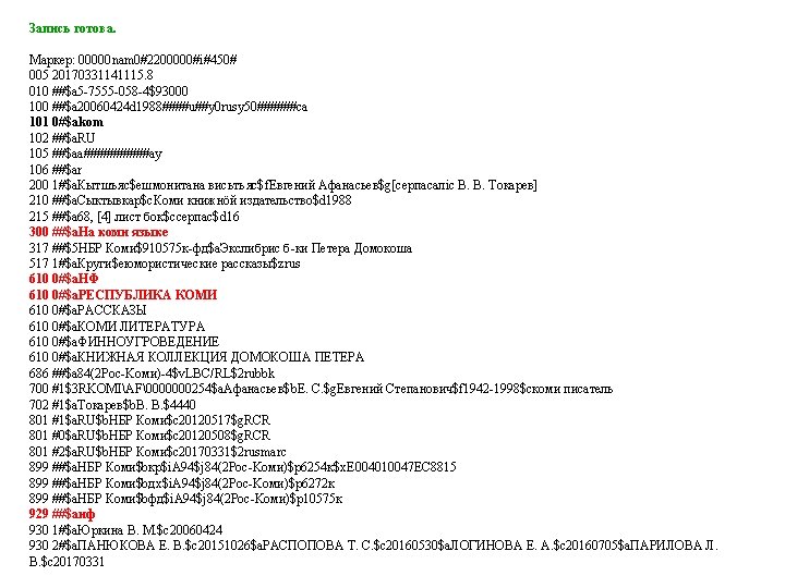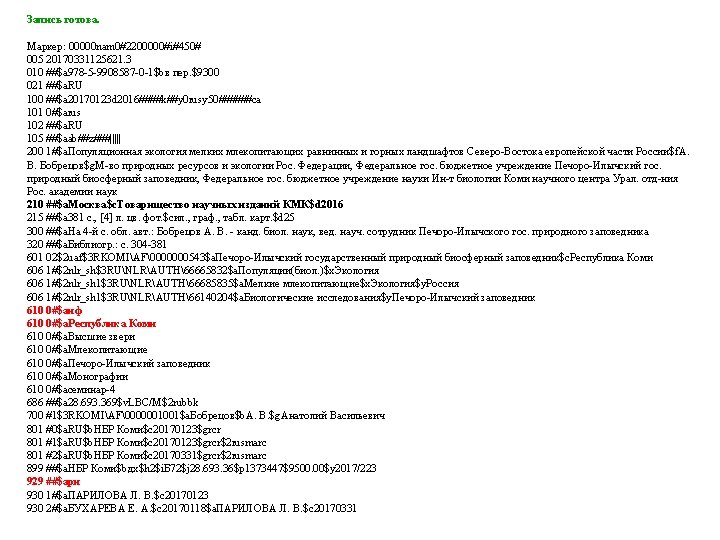 00000 nam 02200000i450 005 20170331123554 3 010 a Slides: 53 Download presentation Запись готова. Маркер: 00000 nam 0#2200000#i#450# 005 20170331123554. 3 010 ##$a 978 -5 -699 -91060 -1$bв пер. $95000 021 ##$a. RU$b 2017 -2939 035 ##$a. RUNLRBIBL_A 11327321 100 ##$a 20170216 d 2016 a y 0 rusa 50 ca 101 0#$arus 102 ##$a. RU 105 ##$aa z 000 ay 200 1#$a. Тот, кто стоит за спиной$a. Страж водопоя$e[повести]$f. Эдуард Веркин 210 ##$a. Москва$c. Эксмо$d 2016 215 ##$a 508, [2] с. $cил. $d 22 225 1#$a. Большая книга ужасов$v 70 333 ##$a 12+ 610 0#$aнф 610 0#$a. Ужасы (х. л. ) 686 ##$a 84(2=411. 2)6 -445$v. LBC/M$2 rubbk 700 #1$a. Веркин$b. Э. Н. $f 1975 -$g. Эдуард Николаевич$3 RUNLRAUTH7742675 801 #0$a. RU$b. NLR$c 20170216$g. RCR 801 #1$a. RU$b. NLR$c 20170216$2 rusmarc 801 #2$a. RU$b. NLR$c 20170314$2 rusmarc 801 #2$a. RU$b. НБР Коми$c 20170331$2 rusmarc 899 ##$a. НБР Коми$bдх$h 84$i. В 32$j 84(2=411. 2)6$p 1374496$9236. 50$y 2017/306 929 ##$aмр 930 1#$a. БУХАРЕВА Е. А. $c 20170315 930 2#$a. БУХАРЕВА Е. А. $c 20170315$a. ПАРИЛОВА Л. В. $c 20170331