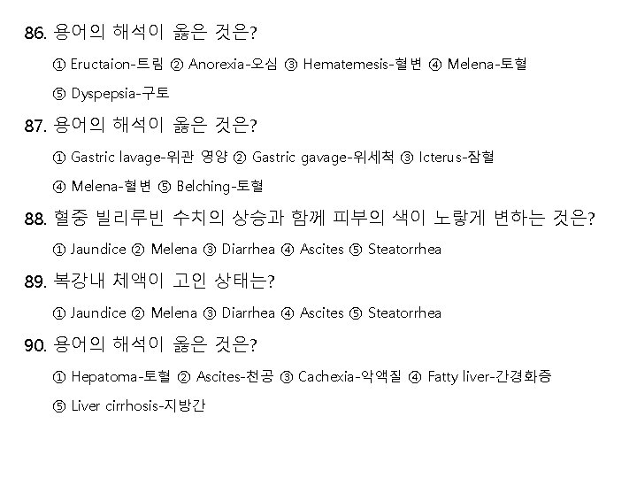91. 간세포에 지방이 침착된 상태는? ① Hepatoma ② Hepatomegaly ③ Liver cirrhosis ④ Fatty liver ⑤ Hepatitis 92. CBD stone과 같은 진단명은? ① Choledocholithiasis ② Cholecystitis ③ Cholangitis ④ Cholelithiasis ⑤ Pancreatitis 93. 용어의 해석이 옳은 것은? ① Cholecystitis-담석증 ② Cholangitis-총담관염 ③ Cholelithiasis-담낭염 ④ Gallstone-담낭 ⑤ Choledocholithiasis-총담관결석증 94. Jaundice와 관련 없는 용어는? ① Hepatitis ② Bilirubin ③ Liver cirrhosis ⑤ Hemoglobin ④ Icterus 95. 용어의 해석이 옳은 것은? ① Ascites-복막염 ② Melena-오심 ③ Volvulus-장축념 ⑤ Jaundice-구토 ④ Icterus-담석