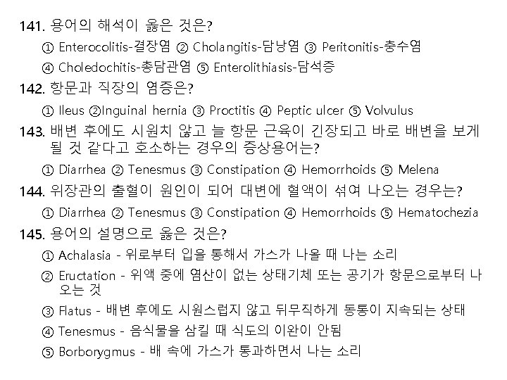 136. Spastic colon으로 스트레스와 긴장이 원인이며 설사, 변비, 복부통증 의 증상을 보이는 질환은? ① Irritable bowel syndrome ② Crohn’s disease ③ Dysentery ④ Enterocolitis ⑤ Ulceritive colitis 137. 장내 gas가 차 있는 경우 들리는 장음은? ① Eructation ② Pyrosis ③ Halitosis ④ Borborygmus ⑤ Tympanites 138. 대변검사 결과 대변에 혈액이 섞인 상태는? ① Hematochezia ② Ascites ③ Diarrhea ④ Constipation ⑤ Steatorrhea 139. 충수돌기의 염증은? ① Ileitis ② Proctitis ③ Appendicitis ④ Pancreatitis ⑤ Cecitis 140. 결장 내시경 검사 결과 대장의 내부 점막층에 양성종양이 있다는 설 명을 들었다면? ① Esophageal varices ② Colonic polyposis ③ Enterolith ④ Crohn’s disease ⑤ Regional enteritis