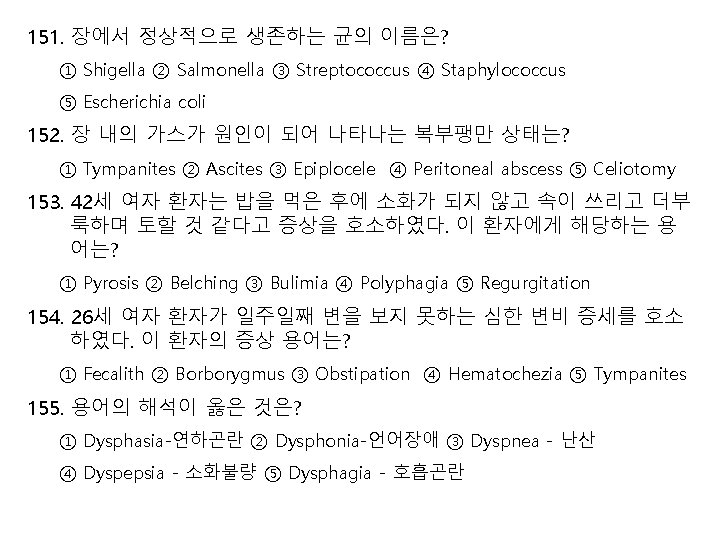156. 동의어의 연결이 옳은 것은? ① Jaundice-belching ② Ptyalism-regurgitation ③ Glossodynia–salivation ④ Anorexia-icterus ⑤ Halitosis-offensive odor 157. Loss of appetite는? ① Anorexia ② Deglutition ③ Hematemesis ④ Regurgitation ⑤ Dyspepsia 158. 용어의 해석이 옳은 것은? ① Borborygmus-천공 ② Pyrosis-복명 ③ Eructation-황달 ④ Tympanites-고창 ⑤ Ptyalism-구취증 159. 입원 중인 50세 남자 환자가 내일 아침 위 내시경 검사를 위해 오늘 밤부터 아무것도 먹지 말 것을 의사로부터 지시받았다. 이 환자가 지 켜야 할 내용을 뜻하는 약어는? ① GI ② FGS ③ NPO ④ pc ⑤ TPN 160. 65세 여자 환자가 식사 전에 FBS test를 실시한 결과 정상보다 높은 수치를 보였다면? ① Hyperglycemia ② Hyperglycosuria ③ Hyperbilirubinemia ④ Hyperchlorhydria ⑤ Hypercholesterolemia