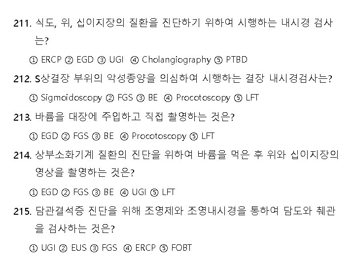 206. Pyloric 환자의 치료를 위한 협착을 완화시키는 수술명은? ① Colostomy ② Billoth I operation ③ Mile’s operation ④ Gastroduodenostomy ⑤ Fredet - Ramstedt operation 207. 담도계 질환의 치료를 위하여 복직근 외측으로 세로로 절개하여 담낭 을 노출시키는 수술기법은? ① Mac. Berney incision ② Paracentesis ③ Bevan’s incision ④ Gastroduodenostomy ⑤ Diverticulectomy 208. Obesity 환자에게 위의 용적을 줄이기 위해 시행되는 수술은? ① Gastric gavage ② Gastric lavage ③ Diverticulectomy ④ Appendectomy ⑤ Bariatric surgery 209. 직장암과 염증성 대장질환을 치료하기 위한 수술로 복부와 회음부 양 쪽으로 결장과 직장을 제거하는 수술은? ① Abdominoperineal resection ② Billoth I operation ③ Billoth II operation ④ Gastroduodenostomy ⑤ Duhamels operation 210. 내시경을 이용하여 역행성으로 조영제를 주입하여 췌관과 담관의 형 태를 보는 영상의학검사는? ① ERCP ② FGS ③ UGI ④ Cholangiography ⑤ Cholecystography