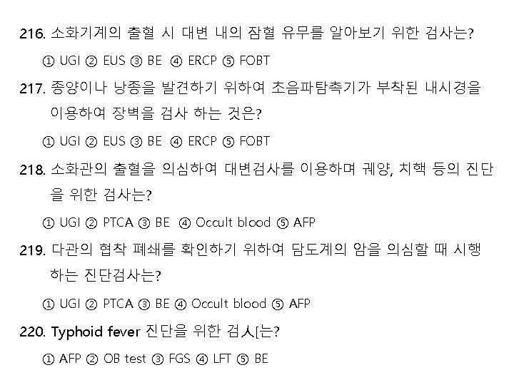 161. Mcburney’s point를 신체검진에서 진단 검사로 이용하는 진단명은? ① Acute appendicitis ② Diverticulectomy ③ Vagotomy ④ Stomach cancer ⑤ Duodenal ulcer 162. 소화계에 작용하는 약물이 아닌 것은? ① Antacid ② Laxatives ③ Antiemetics ④ Cathartics ⑤ Heparin 163. 복부 신체검진 중 청진으로 장음을 들어 본 결과 장의 연동운동이 일 어나지 않는다고 했다면 장의 상태를 나타내는 용어는? ① Borborygmus ② Eructation ③ Flatus ④ Tenesmus ⑤ Achalasia 164. 대장 내시경 검사 결과 궤양을 동반한 결장의 염증이라면 진단명은? ① Peptic ulcer ② Sensitive enteritis ③ Ulcerative colitis ④ Colon carcinoma ⑤ Crohn’s disease 165. 3세 된 소아 환자가 구강 내 반점을 보여 검사 결과 진균 감염이 원인 이라고 한다. 이 환자의 진단명은? ① Trench mouth ② Cleft palate ③ Cleft lip ④ Thrush ⑤ Xerostomia