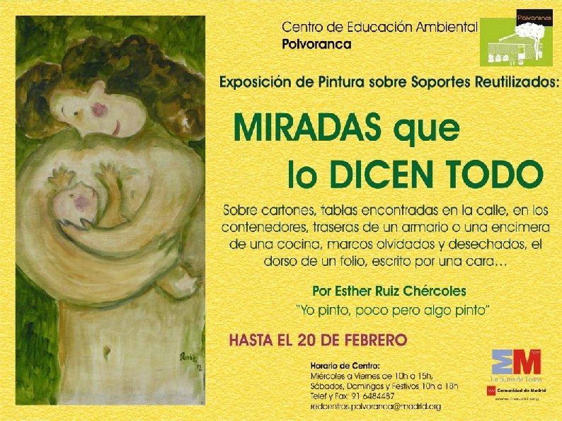 MIRADAS QUE LO DICEN TODO Los materiales donde pinto siguen siendo reutilizados, son cartones, tablas, lienzos encontrados, donados, desechados… Reutilizar significa guardar y volver a utilizar. Se trata de dar una nueva vida a algo que se pensaba tirar o ya se había tirado. Recojo tablas, cuando las veo por ahí, abandonadas, me las llevo. No puedo evitarlo, me viene de familia, mi abuelo también lo hacía. He aprendido a integrar las “erres” en mi vida: mejor reducir y reutilizar que reciclar. Muchas veces, cuando necesito algo, cierro los ojos y… no tarda en aparecer. Es probable que tenga el síndrome de Diógenes, como Chema piensa, pero de momento creo que está controlado, o es lo que yo pienso. Además este soporte es el mejor para dar rienda suelta al artista que todos llevamos dentro. ¿Te atreves? Todos los niños disfrutan con las pinturas, garabatean… ¿Qué nos pasa después? Picasso dijo que había necesitado toda una vida, 92 años, para dibujar como un niño. Ellos son los verdaderos maestros y todos seguimos llevando al niño que fuimos ¿No es verdad? Hice una exposición en este mismo centro hace ya tres años y muchos de aquellos cuadros no volvieron conmigo. Aquello fue un estímulo para seguir pintando y en verano aprovecho, cuando me quedo sola en casa. Al pintar, pierdo la noción del tiempo. Una pintura me lleva a otra, lo que sobra de un color, se aprovecha en el siguiente. Aquí como en tantas cosas, no se tira nada, se rebaña la paleta hasta arrancar el último matiz de color. Pinto a trompicones, puedo estar meses sin coger un pincel, pero cuando lo agarro, pinto de forma compulsiva, obsesiva y el cuadro me absorbe por completo. Picasso, siempre Picasso, decía que la inspiración llega trabajando y una cosa lleva a la otra. Siempre hay sitio y si no, se hace una exposición y se recolocan (otra erre).