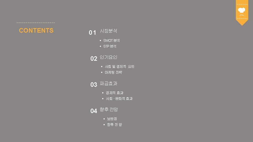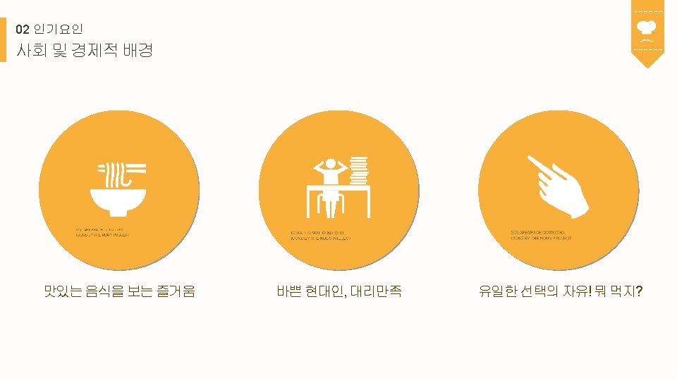 02 인기요인 사회 및 경제적 배경 Insert Title Here Lorem Ipsum is simply dummy text of the printing and typesetting industry. Lorem Ipsum has been the industry's standard dummy text ever since the 1500 s, when an unknown printer took a galley of type and scrambled it to make a type specimen book. It has survived not only five centuries, but also the leap into electronic typesetting, remaining essentially unchanged. It was popularised in the 1960 s with the release of Letraset sheets containing Lorem Ipsum passages, and more recently with desktop publishing software like Aldus Page. Maker including versions of Lorem Ipsum. 맛있는 음식을 보는 즐거움