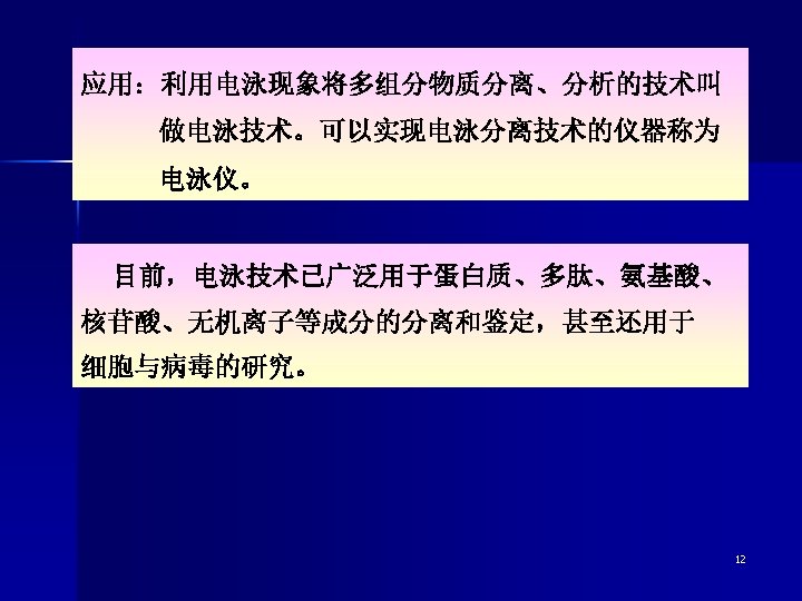 l Electrophoresis 电泳 带电荷的溶质或粒子在电场 中向着与其本身所带电荷相 Level rising Level lowing 反的电极移动的现象。 Almost all colloidal particles have an electrical chargeeither positive or negative. 11
