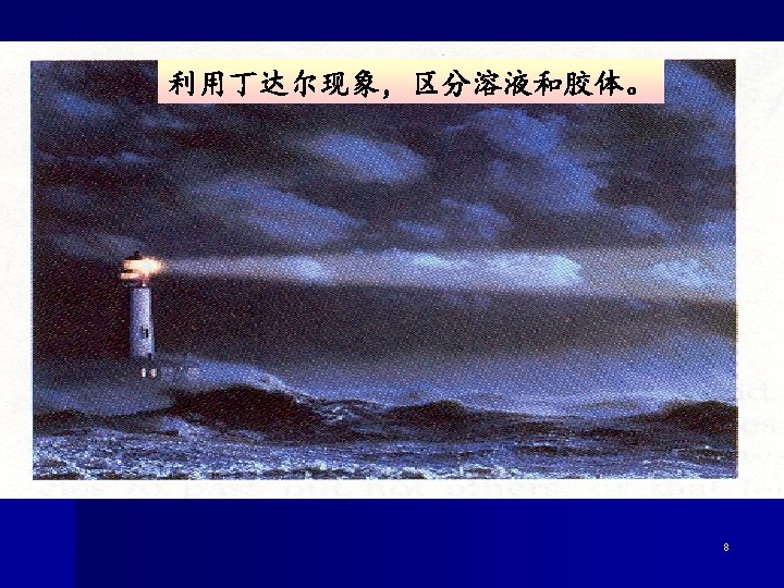 l Tyndall Effect When a light beam enter through a colloidal dispersion, the beam becomes visible. This phenomenon, known as the Tyndall effect. It is due to the fact that small particles scatter light in all directions. 6