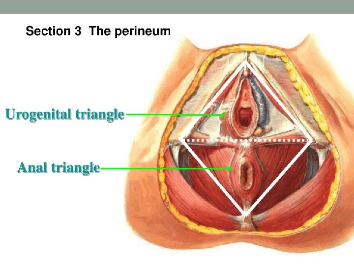 The perineum • The perineum to the outer of the pelvis and is some what lozenge- shape : anteriorly it is bounded by the pubic arch , posteriorly by the coccyx, and laterally by the ischiopubic rami, ischial tuberosities and sacrotuberous ligament • The perineum divided into two triangular part: • 1. the urogenital triangle • 2. the anal triangle