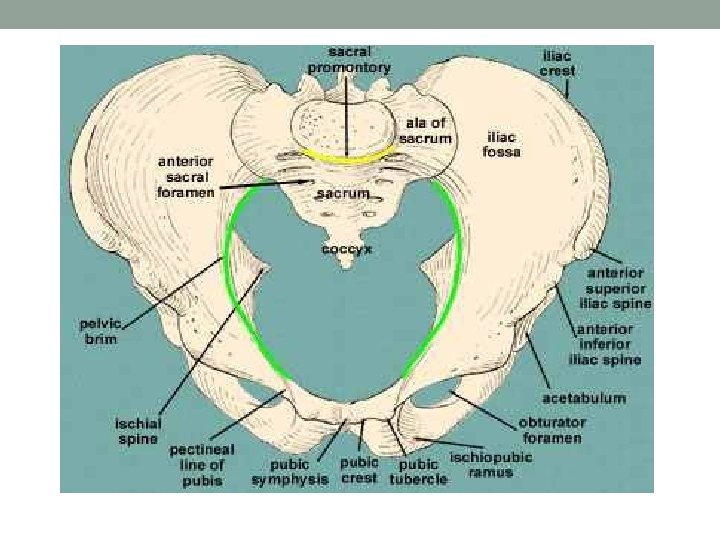 Sacral promontory • 2 Innomina te bone sacrum coccyx Ischail spine Symphsis pubis