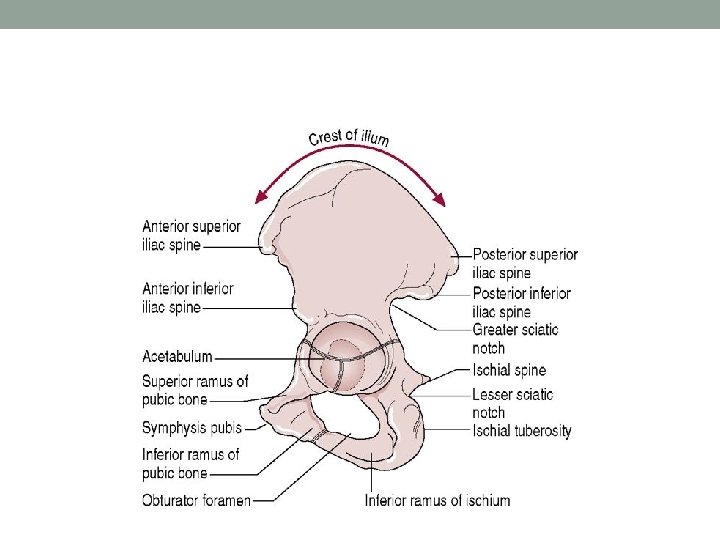 Innominate bone • Each innominate bone or( hip bone) is mad up of three bones have fused together : the ilium, ischium, and pubis. It is fixed bone.