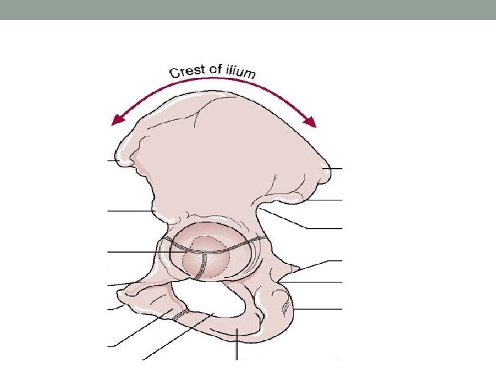 The ilium • has an upper & lower part. The smaller lower part form part of acetabulum and the upper part is the large flared out part. When the hands is placed on the hip it rests on the iliac crest which known as anterior superior iliac spine.