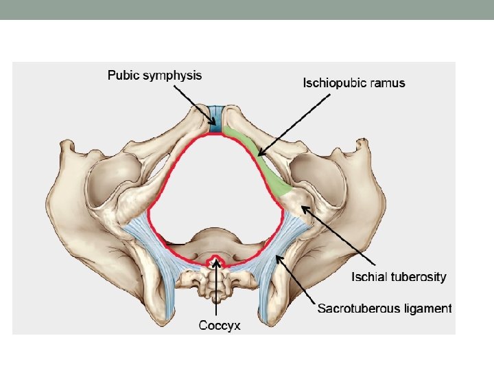 The pelvic outlet The anatomical outlet is formed by the lower borders of • each of the bones togehter with the sacrotuberous ligament. It include the narrow pelvic strait which the fetus must pass.