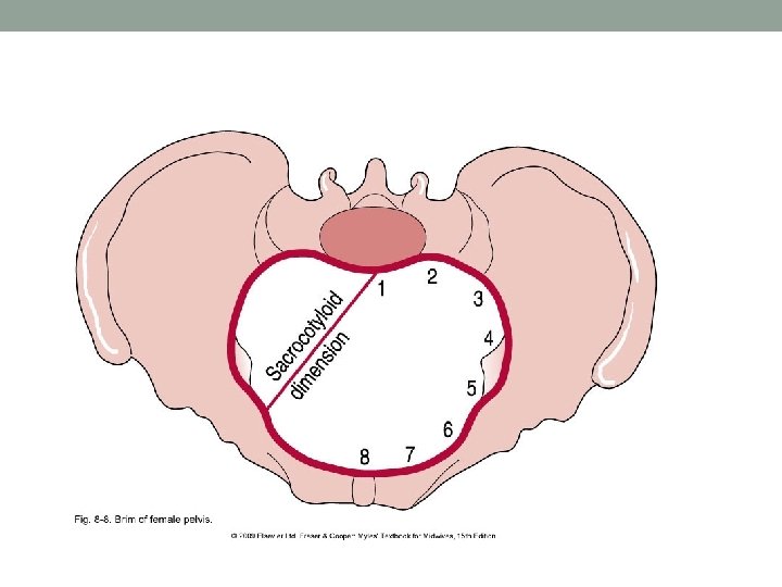 1 - Sacral Promotory 2 - Sacral ala (wing) 3 - Sacral iliac joint 4 - Illiopectineal line 5 - Illiopectineal eminence 6 - Superior pubic ramus 7 - Body of pubic bone 8 - Symphysis pubis
