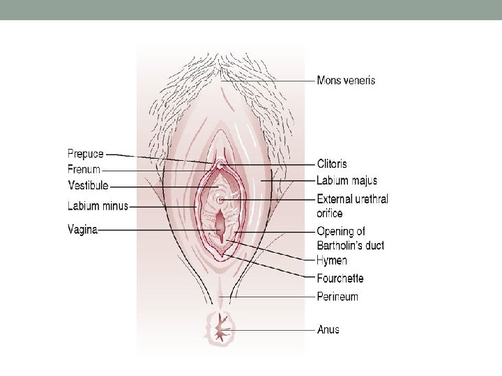 External genitalia mons pubis Labium majus Labium minus Urethral orifice Vaginal vestibule Perineal body Anus