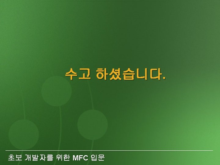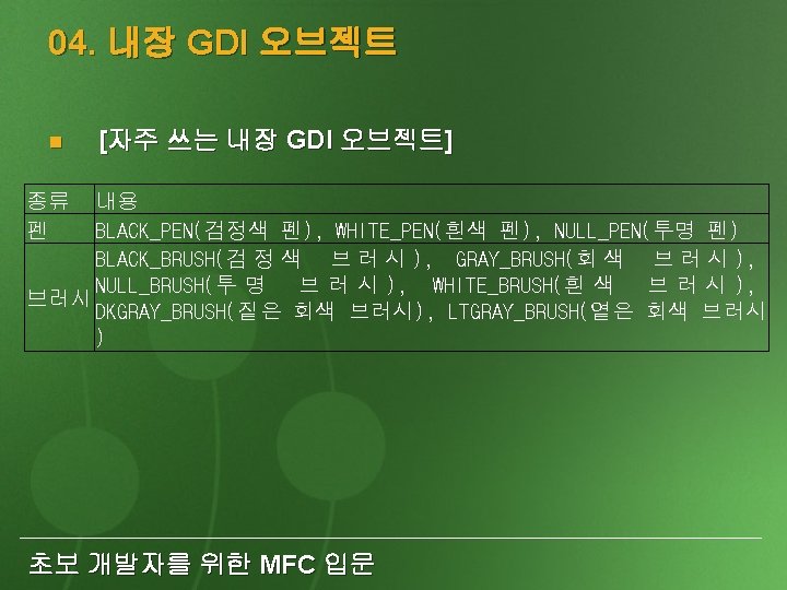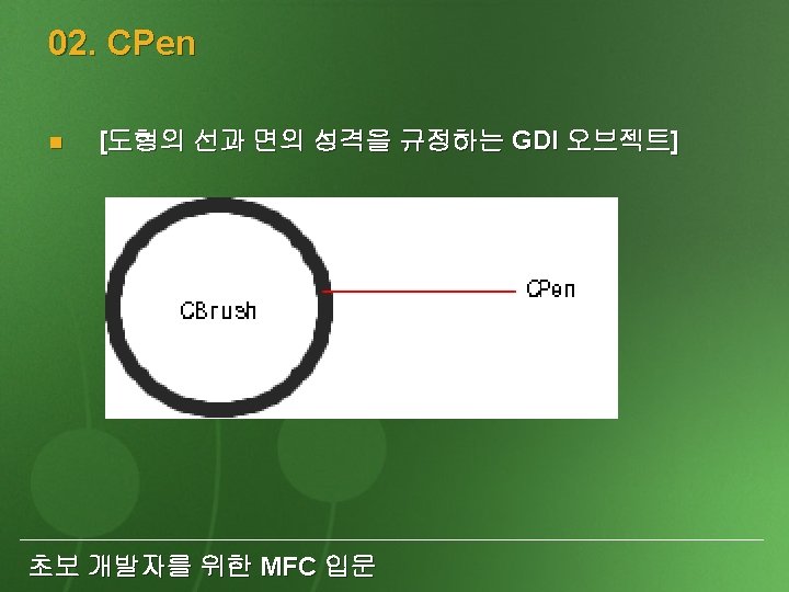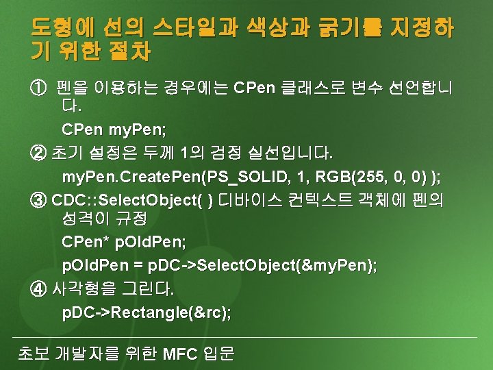 05 CFont font oldfont font Create font oldfont Slides: 20 Download presentation 05. CFont font, *oldfont; font. Create. . . //폰트를 만든다. //font를 설정하고 이전 폰트를 oldfont에 넣어둔다. p. DC->Select. Object(&font); p. DC->Select. Object(oldfont); //이전 폰트를 설정한다. font. Delete. Object(); //폰트를 삭제한다. 초보 개발자를 위한 MFC 입문 비트맵의 크기를 알려주는 Get. Bitmap( ) 메 소드 BITMAP bmpinfo; bitmap. Get. Bitmap(&bmpinfo); typedef struct tag. BITMAP { LONG bm. Type; LONG bm. Width; LONG bm. Height; LONG bm. Width. Bytes; WORD bm. Planes; WORD bm. Bits. Pixel; LPVOID bm. Bits; } BITMAP; 초보 개발자를 위한 MFC 입문