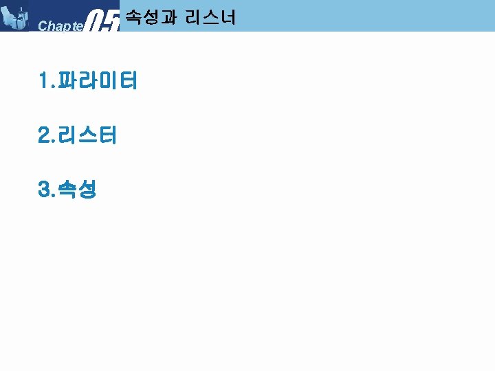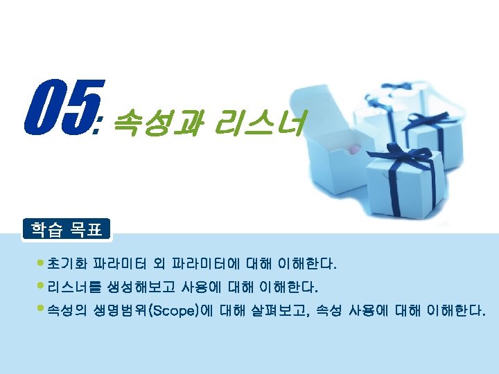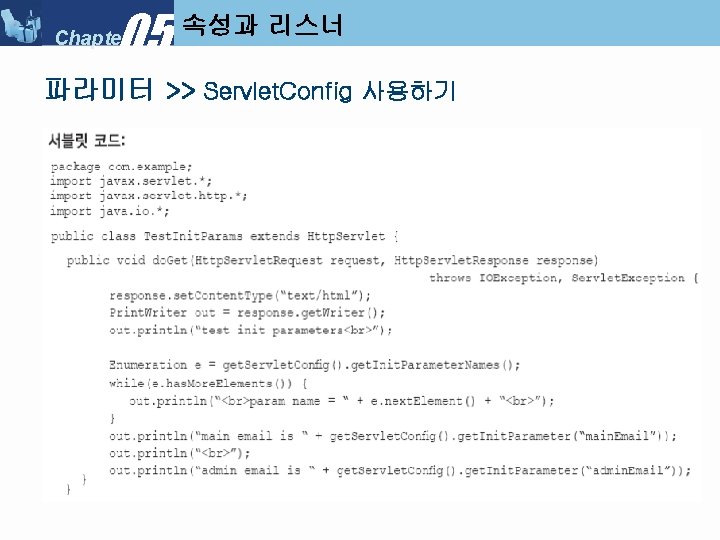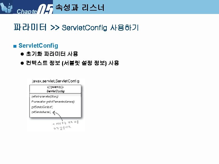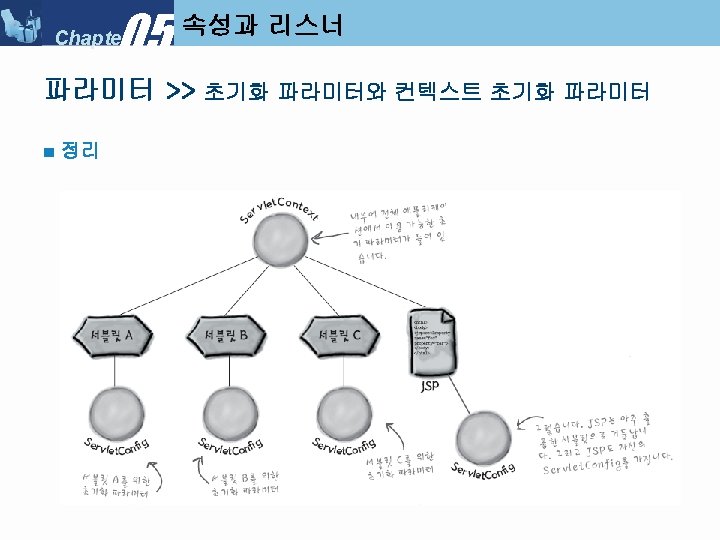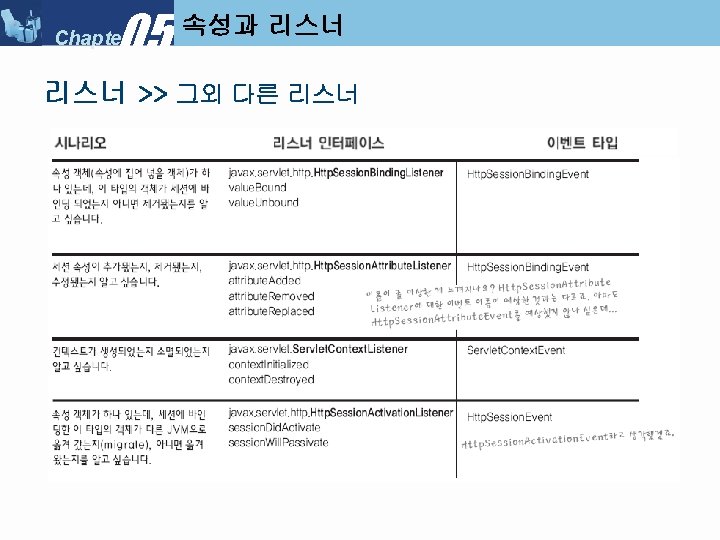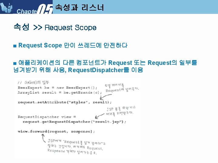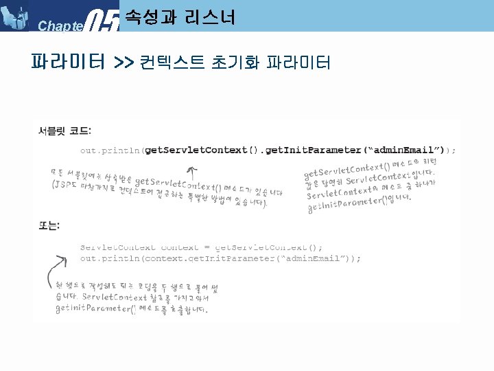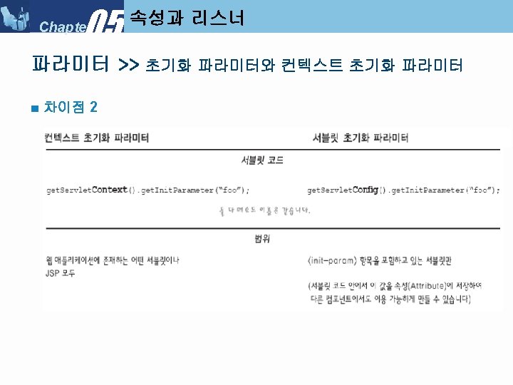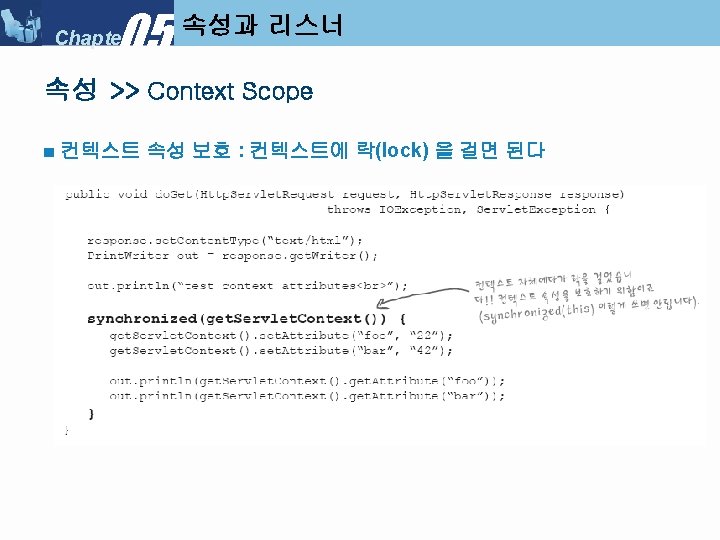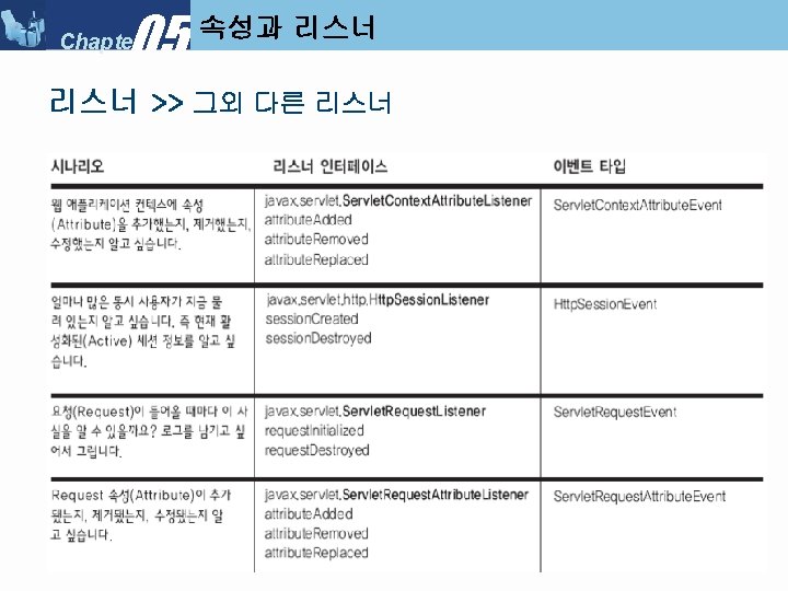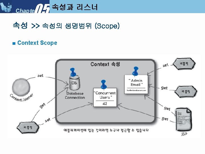 05 Chapter Servlet Context Listener My Servlet Context Slides: 34 Download presentation 05 Chapter 속성과 리스너 >> Servlet. Context. Listener 만들기 ■ 리스너 클래스 만들기 : My. Servlet. Context. Listener 05 Chapter 속성과 리스너 >> Servlet. Context. Listener 실행순서 ■ Servlet. Context. Listener 실행 순서 (1) 05 Chapter 속성과 리스너 >> Servlet. Context. Listener 실행순서 ■ Servlet. Context. Listener 실행 순서 (2) 05 Chapter 속성과 리스너 >> Servlet. Context. Listener 실행순서 ■ Servlet. Context. Listener 실행 순서 (3) 05 Chapter 속성과 리스너 >> Servlet. Context. Listener 실행순서 ■ Servlet. Context. Listener 실행 순서 (4) 05 Chapter 속성과 리스너 속성 >>속성 (Attribute) ■ 속성(Attribute) 란? l Servlet. Context, Http. Servlet. Request, Http. Servlet. Response, Http. Session 객체 중 하나에 설정해 놓는 객체(Object) 이다. ■ 속성과 파라미터의 차이점 05 Chapter 속성과 리스너 속성 >> Request. Dispatcher ■ Request. Dispatcher 를 얻는 방법 05 Chapter 속성과 리스너 속성 >> Request. Dispatcher ■ Request. Dispatcher 사용