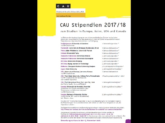 CAU-Austauschstipendien Studium in Europa, Asien und Nordamerika • jede Uni hat eigene Stipendien • Austauschprogramm der CAU: derzeit 14 Partnerhochschulen • 25 Jahresstipendien (davon 24 Stipendien teilbar) • Ausschreibung erfolgt immer im SS, Bewerbungsschluß: 15. 11. 2016 • Informationsveranstaltungen zur Bewerbung: stehen noch nicht fest • Bewerbungsformulare und Stipendienkonditionen auf der Webseite