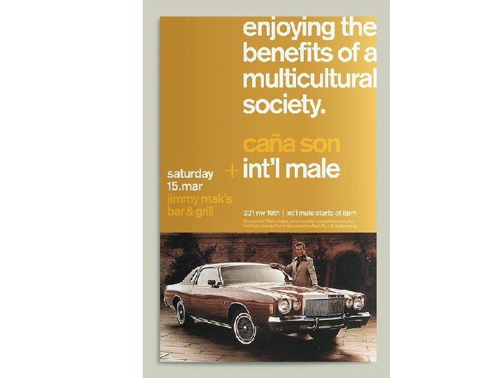 Swiss Design (International Typographic Style) - asymmetrical organization - grid - objective photography - clear and factual - sans serif typography Herbert Matter, Max Bill, Otl Aicher, Emil Ruder, Armin Hofmann, Josef Müller-Brockmann - (Chapter 18, Meggs) Armin Hofmann, 1954