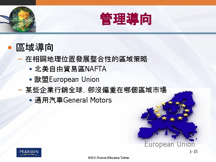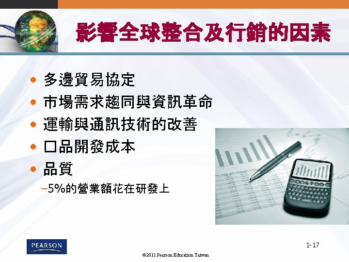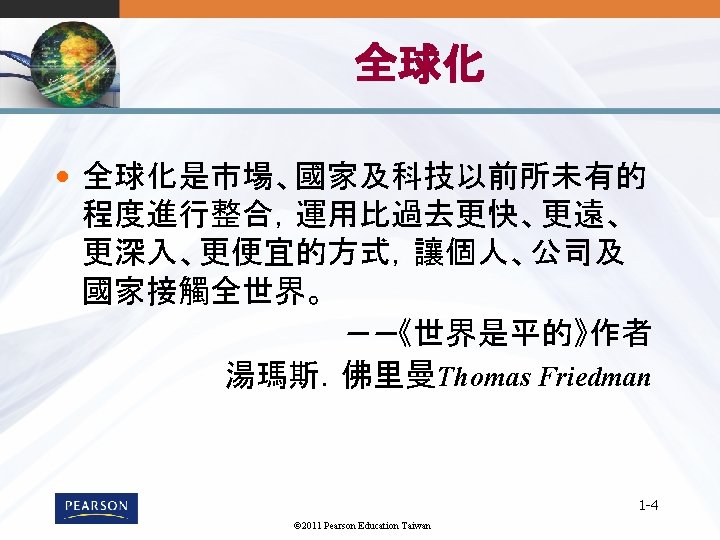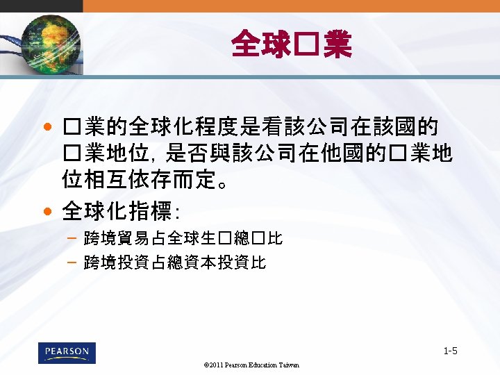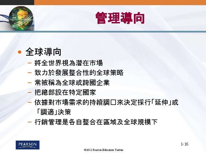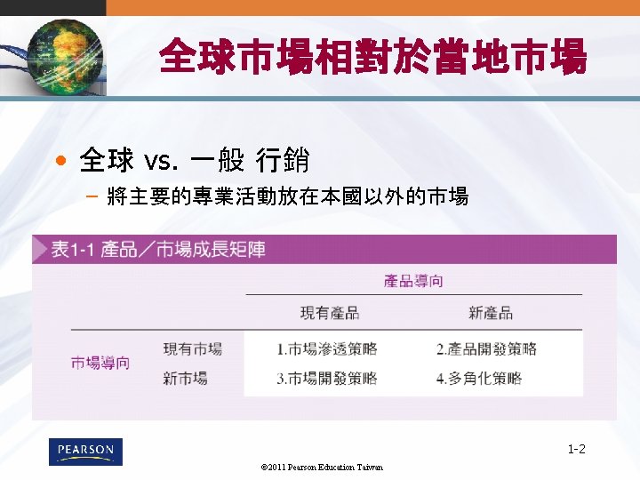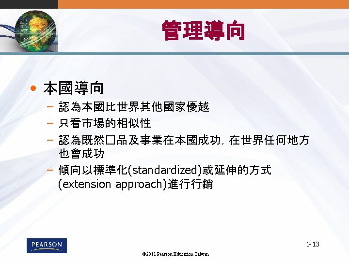 1 1 1 2011 Pearson Education Taiwan 1 Slides: 22 Download presentation 第 1章 全球行銷導論 1 -1 © 2011 Pearson Education Taiwan 全球行銷的樣貌 1 -7 © 2011 Pearson Education Taiwan 標準化與調適化 • 全球市場參與Globalization (標準化) – 發展標準化的�品,並用標準化的行銷組合行銷至 全球 – Essence of mass marketing • 全球在地化Global localization (調適化) – 結合標準化及客製化mization in a way that minimizes costs while maximizing satisfaction – Essence of segmentation – 思考全球化, 行動在地化 1 -8 © 2011 Pearson Education Taiwan Mc. Donald的全球行銷案例 © 2011 Pearson Education Taiwan 《財星》五百大服務及製造業 1 -11 © 2011 Pearson Education Taiwan 消費性/ 業品市場 1 -12 © 2011 Pearson Education Taiwan UNIQLO的賣場 1 -22 © 2011 Pearson Education Taiwan