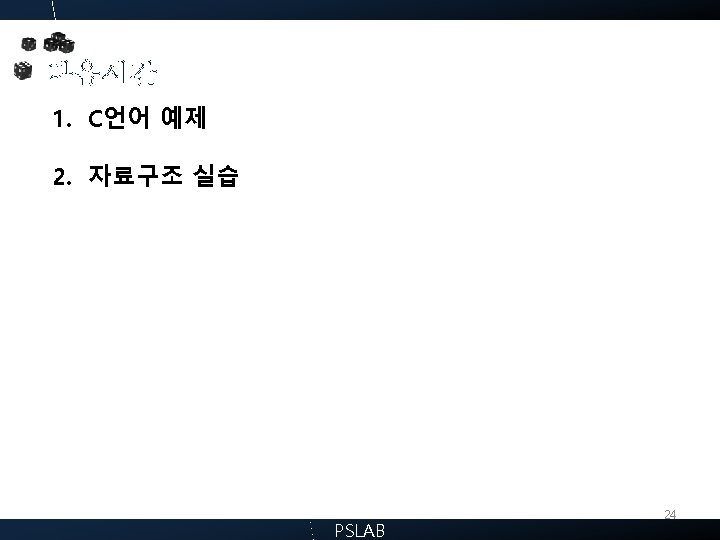 5. 구조체 5. 3. 구조체 활용 예제 … typedef struct{ int num; char name[50]; }info; main() { info i 1; i 1. num=10; strcpy(i 1. name, ”jin”); i 1. num+=1; … } printf(“i 1. num=%d i 1. name=%sn”, i 1. num, i 1. name); PSLAB 22