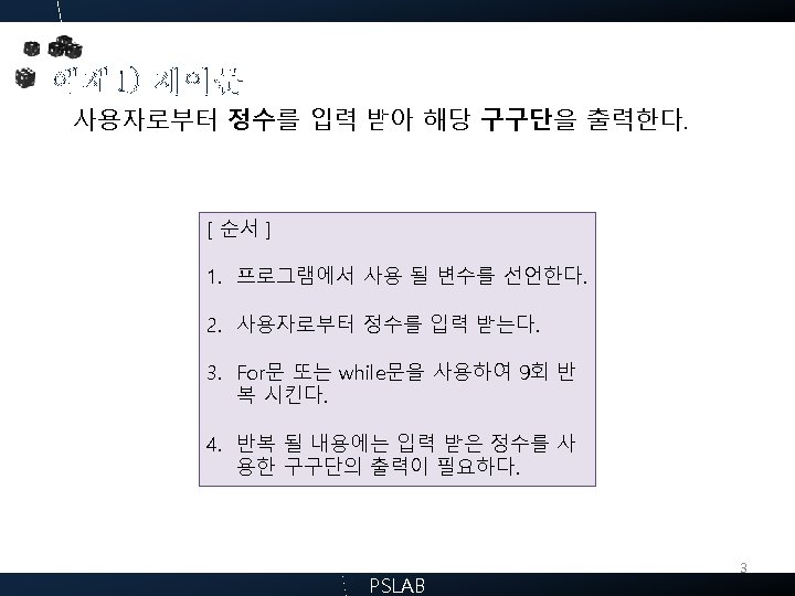 2. 배열 2. 1. 배열이란? 배열 변수 변수 list[0] int a; char ch; 변수 list[1] 변수 list[2] int list[3]; char chs[3]; PSLAB 9