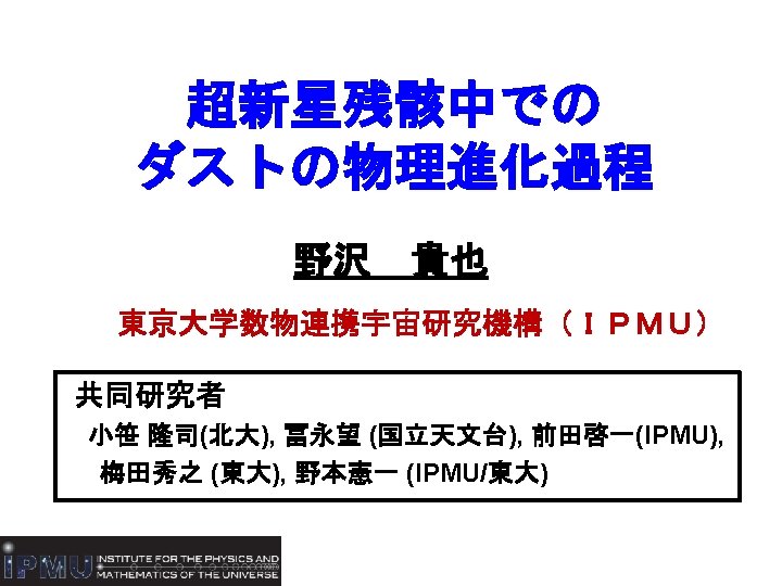 2 -1. Calculation of dust evolution in SNR ○ Model of calculations (Nozawa et al. 2006, 2007) ・ejecta model - hydrodynamic model for dust formation calculation ・ISM - homogeneous, Tgas=104 K - n. H = 1. 0 and 10. 0 cm-3 - solar composition of gas ・treating dust as a test particle - erosion by sputtering - deceleration by gas drag - collsiional heating