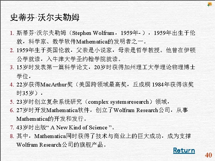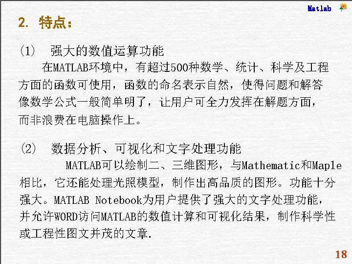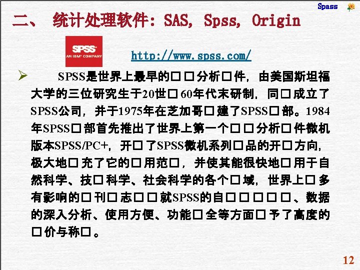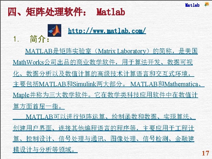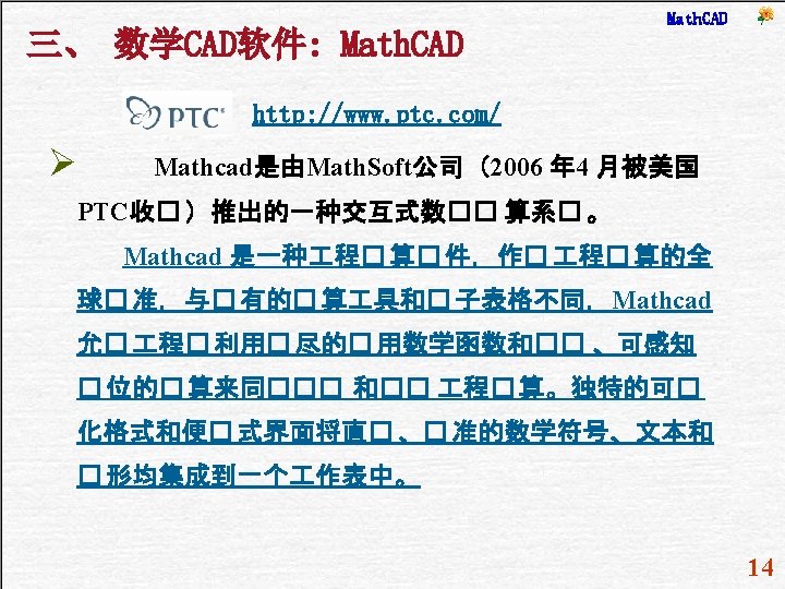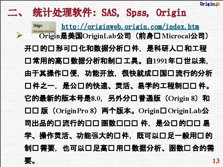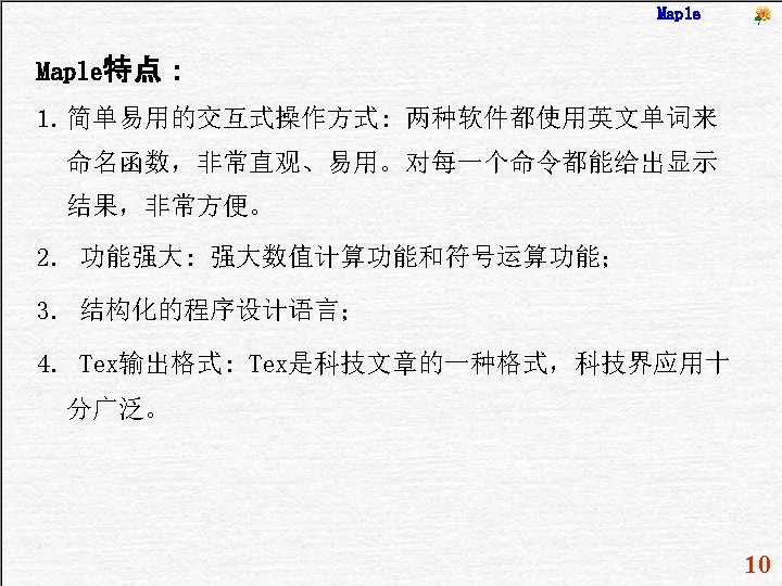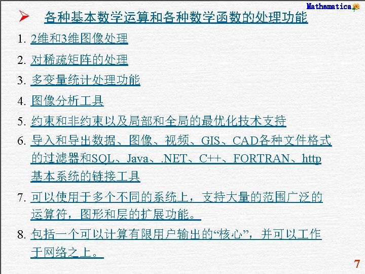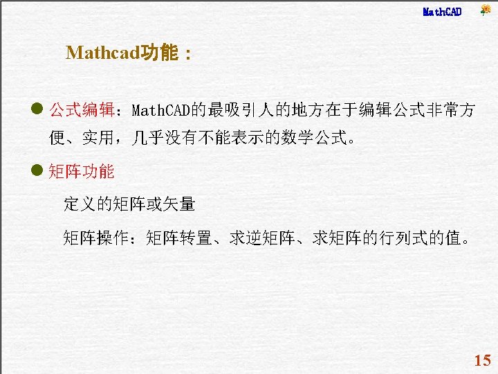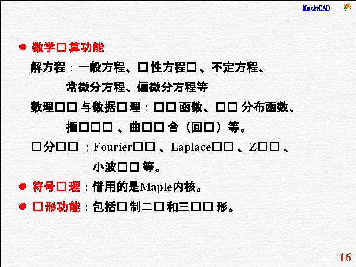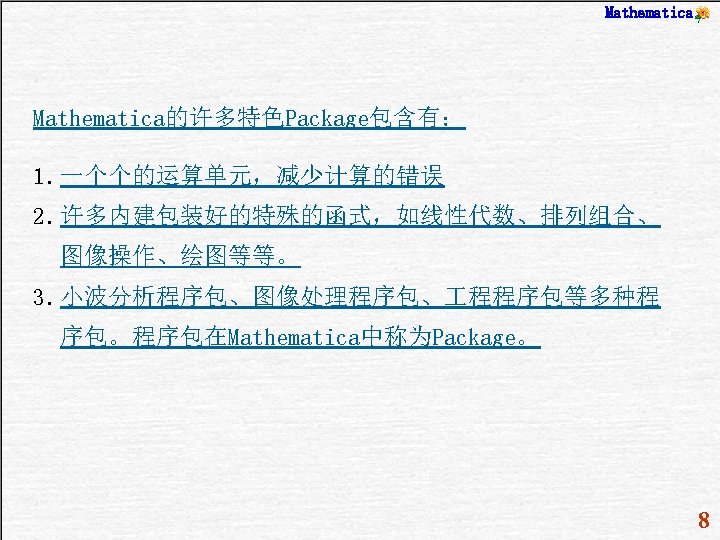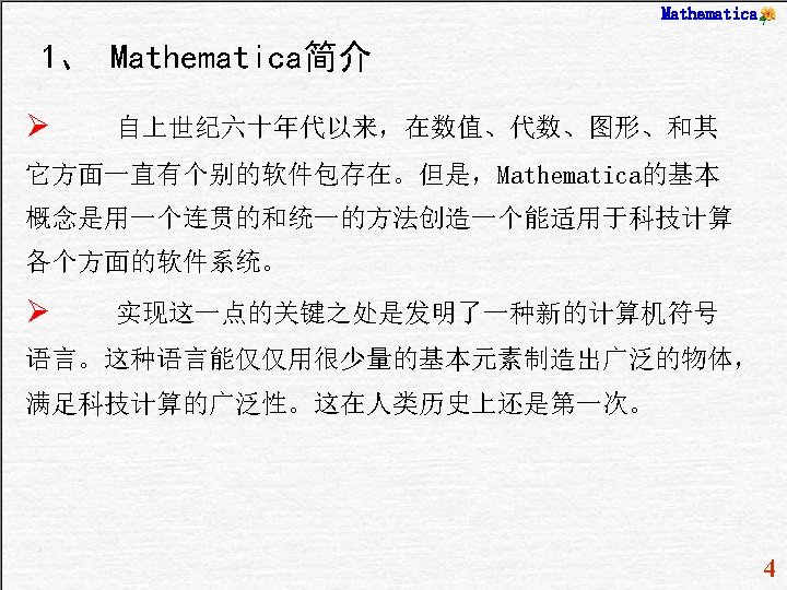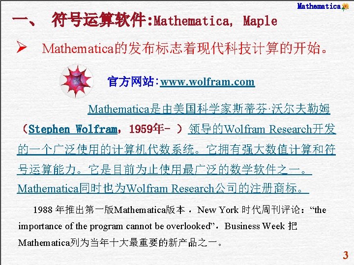 内 容 § 1. 1 符号运算软件 Mathematica, Maple § 1. 2 统计处理软件 SAS, Spss, Origin § 1. 4 数学CAD软件 Math. CAD § 1. 5 矩阵处理软件 Matlab 2