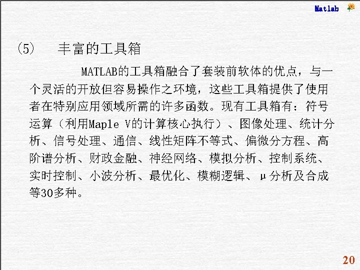 Matlab MATLAB中与数学相关的 具箱(续) nnetnnet - Neural Network Toolbox. nnetnndemos - Neural Network Demonstrations. toolboxoptim - Optimization Toolbox. toolboxpde - Partial Differential Equation Toolbox. toolboxsplines - Spline Toolbox. toolboxstats - Statistics Toolbox. toolboxsymbolic - Symbolic Math Toolbox. waveletwavelet - Wavelet Toolbox. 24