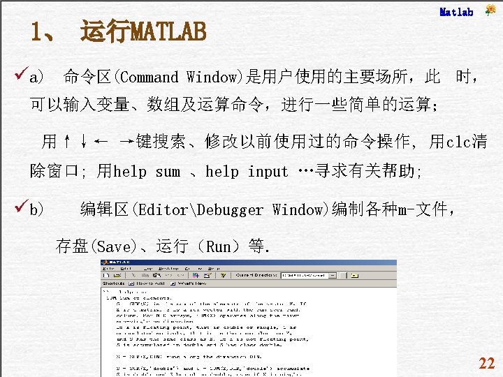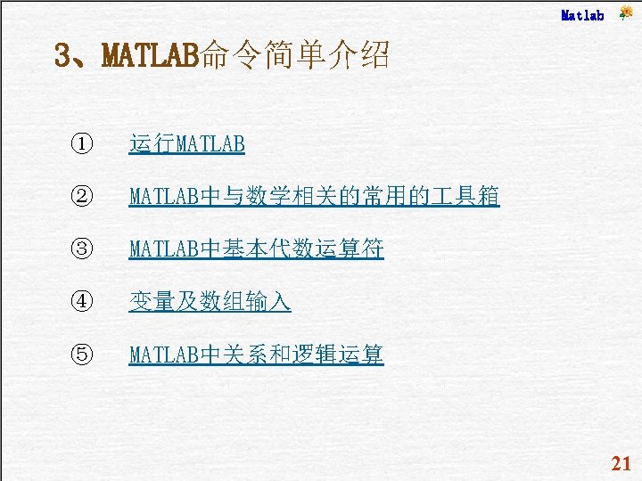 Matlab 2、MATLAB中与数学相关的常用的 具箱 在命令区(Command Window)键入help命令, 可查看 具箱; matlabelmat - Elementary matrices and matrix manipulation. matlabelfun - Elementary math functions. matlabspecfun - Specialized math functions. matlabmatfun - Matrix functions - numerical linear algebra. matlabdatafun - Data analysis and Fourier transforms. matlabpolyfun - Interpolation and polynomials. matlabfunfun - Function functions and ODE solvers. matlabgraph 2 d - Two dimensional graphs. matlabgraph 3 d - Three dimensional graphs. matlabspecgraph - Specialized graphs. 23