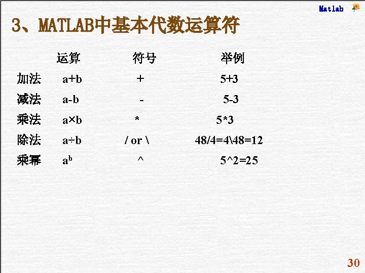 Matlab 具箱及命令查询 help topics 在命令区(Command Window)键入 help ops help lang help elfun help fabs help sqrt 29