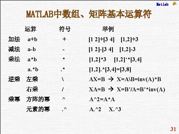 Matlab MATLAB中基本数学函数(续) Rounding and remainder. fix - Round towards zero. floor - Round towards minus infinity. ceil - Round towards plus infinity. round - Round towards nearest integer. mod - Modulus (signed remainder after division). rem - Remainder after division. sign - Signum. 28