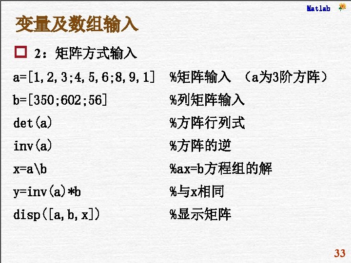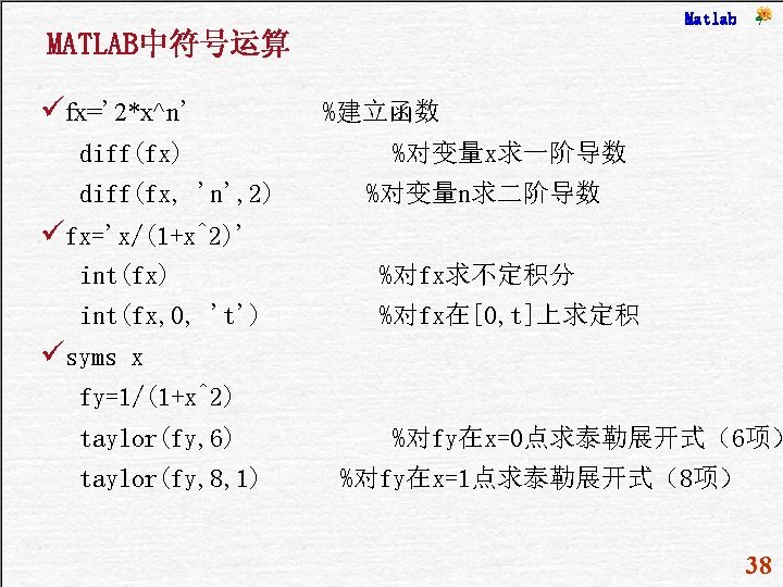 ![Matlab MATLAB中符号函数的表示 符号函数 MATLAB表示 '1/(2*x^n)' '1/sqrt(2*x)' 'sin(x^2)-cos(2*x)' M=sym('[a, b; c, d]') f=int('x^2/sqrt(1 -x)', 'a', Matlab MATLAB中符号函数的表示 符号函数 MATLAB表示 '1/(2*x^n)' '1/sqrt(2*x)' 'sin(x^2)-cos(2*x)' M=sym('[a, b; c, d]') f=int('x^2/sqrt(1 -x)', 'a',](https://slidetodoc.com/presentation_image_h2/73fb95f09bef56bf0c186b4d8e37a5ce/image-37.jpg)