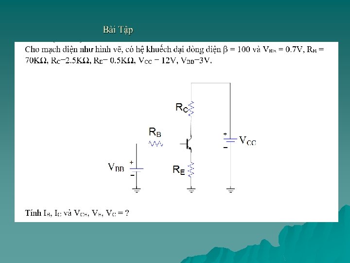 1. 1 Mạch khuếch đại tín hiệu nhỏ: 1. 1. 1 Các kiểu mạch khuếch đại a) Khuếch đại áp u Phân cực DC cho transistor NPN VCC = dc được áp dụng cung cấp điện áp cho các cực thu. u V BB = dc cung cấp điện áp mối nối giữa B và E. u C & B phải dương so với E cho một transistor NPN. u V CE = V CB + V BE va I E = I C + I B