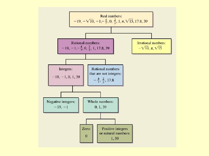 Sets of Numbers Natural Numbers (Counting Numbers) Numbers used for counting: {1, 2, 3, …} Whole Numbers The set of natural numbers with 0 included: {0, 1, 2, 3, …} Integers The set of all whole numbers and their opposites: {…, -3, -2, -1, 0, 1, 2, 3, …}