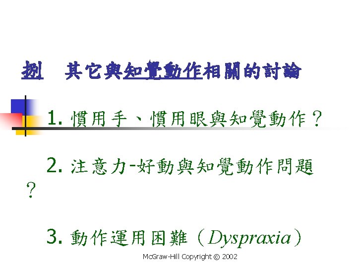 柒 知覺動作歷程 What is Perceptual-Motor ? 知覺動作是否該定義成與學校學習 有關?各位老師的看法? The perceptual-motor concept refers to movement activities, usually involving children, performed with primary intent of improving cognitive or academic skills Mc. Graw-Hill Copyright © 2002