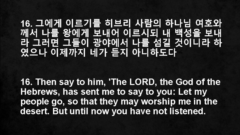 2. 내가 네게 명령한 바를 너는 네 형 아론에게 말 하고 그는 바로에게 말하여 그에게 이스라엘 자손 을 그 땅에서 내보내게 할지니라 2. You are to say everything I command you, and your brother Aaron is to tell Pharaoh to let the Israelites go out of his country.