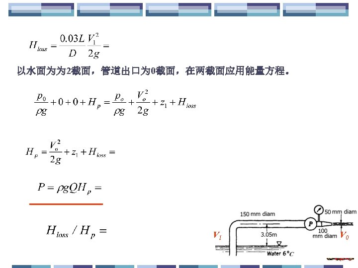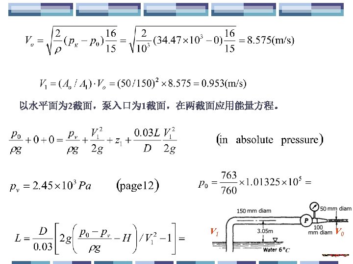 3. 16 The 图 3. 38中显示的水泵系统中,当泵的入口处开始气穴时,压强为 3. 16 pumping system shown in Fig. 3. 38 must have pressure of 34. 47 k. Pa in the discharge line when cavitation is incipient(开始的) at the pump inlet. 34. 47 k. Pa。计算这种运行条件下从水库到泵的管道长度,管道的损失表 Calculate the length of pipe from the reservoir to the pump for this operating 2/2 g)(0. 03 L/D)。泵供给流体的马力(功率)是多少?百分之多少 示为(V 1 condition if the loss in this pipe can be expressed as (V 12/2 g)(0. 03 L/D). What 的功率用来克服流动损失?气压计(测出的是当地大气压)的读数是 762 horsepower is being supplied to the fluid by the pump? What percent of this mm Hg。 power is being used to overcome losses? Barometer reads 762 mm Hg. Solution: By neglecting the loss between the gage and the outlet, (忽略泵 出口和管道出口之间的损失,以管道出口为 0截面,泵出口(表压计所在截面) 为g截面,在此两截面应用能量方程。) By application of continuity equation(连续性方程) V 1 V 0