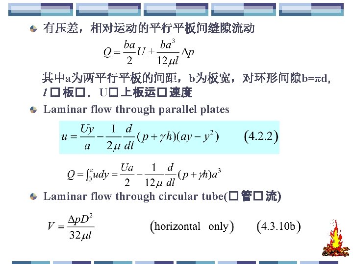第四章 例4. 8; 作业 4. 1, 4. 2, 4. 13,4. 20, 4. 26 Reynolds number(雷诺数) round tubes (圆管) Laminar flow(层流): Re<2000; Turbulent flow(紊流): Re>2000
