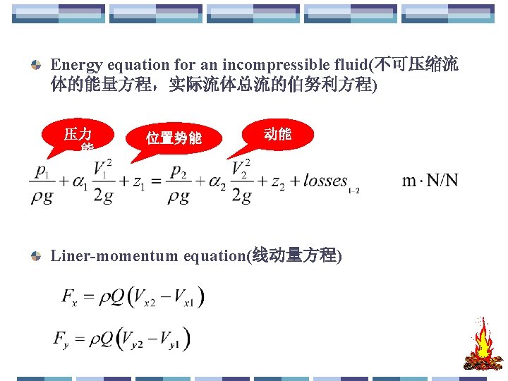 Energy equation (能量方程) laminar flow: =2; turbulent flow: =1 沿程损失 f is friction factor(沿程阻力系数)。 Minor losses(局部损失) (出口数,入口数;按出口速 度系数计算) Laminar flow, Re<2000