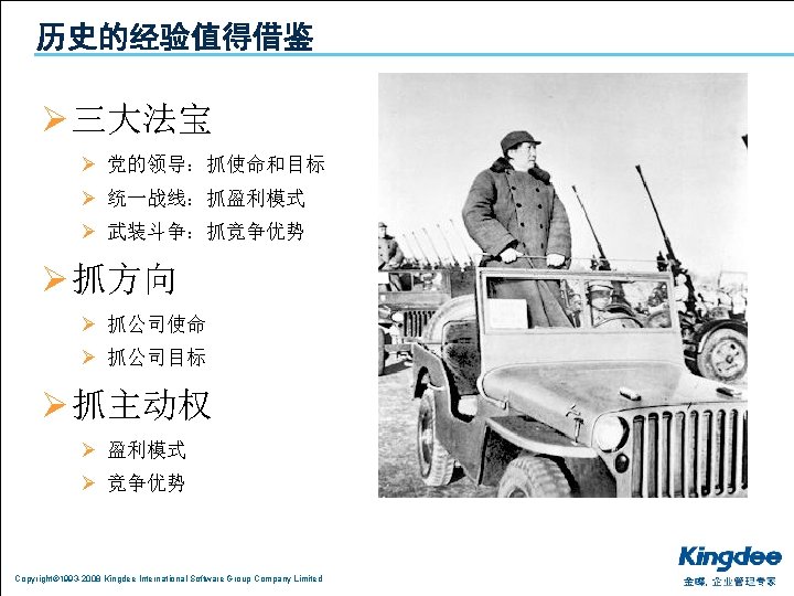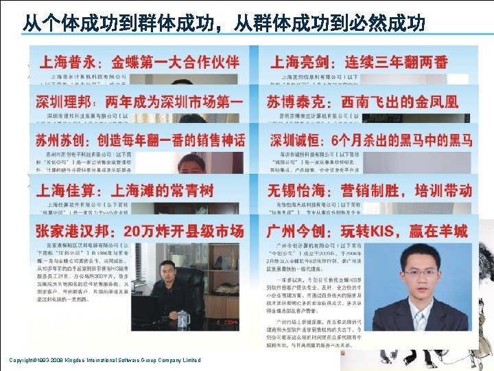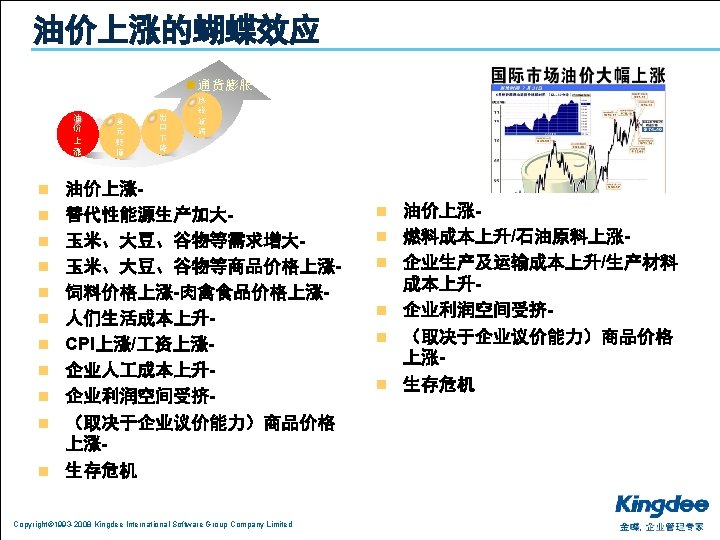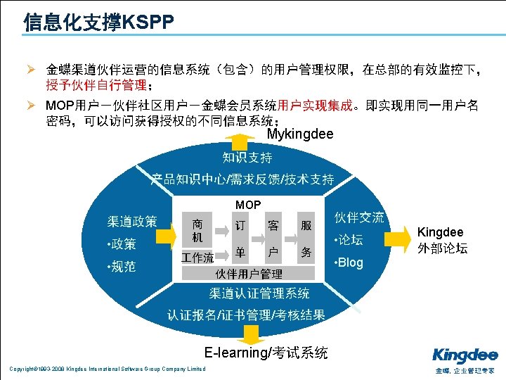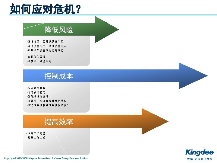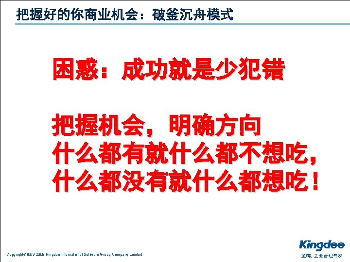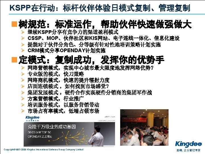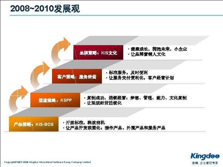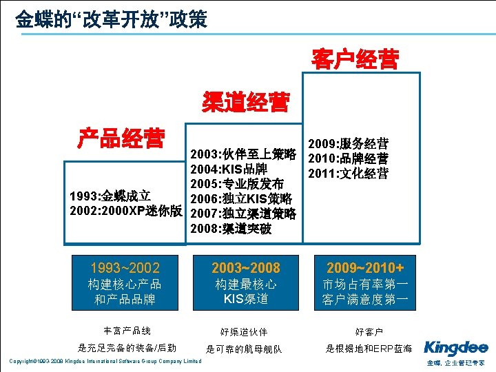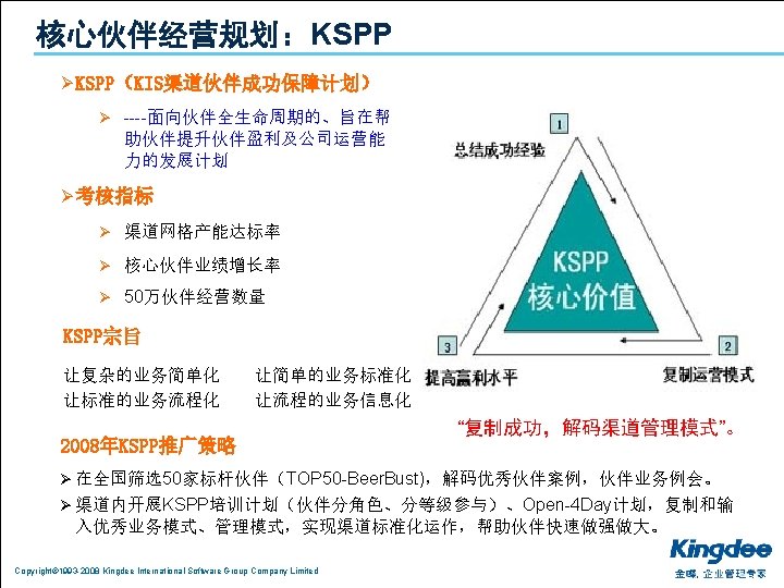 1 2 3 Copyright 1993 2008 Kingdee International Slides: 26 Download presentation 目录 1. 分析:利空的宏观经济环境 2. 共享:中小企业的御寒之道 3. 复制:成功的渠道发展模式 Copyright© 1993 -2008 Kingdee International Software Group Company Limited 上海的房价不是由上海人决定的 n 是由台湾、日本、江浙人决定的 Copyright© 1993 -2008 Kingdee International Software Group Company Limited 影响经济的主要因素 通货膨胀 热钱 漩涡 油价 上涨 美元 贬值 Copyright© 1993 -2008 Kingdee International Software Group Company Limited 出口 下降 目录 1. 分析:利空的宏观经济环境 2. 共享:中小企业的御寒之道 3. 复制:成功的渠道发展模式 Copyright© 1993 -2008 Kingdee International Software Group Company Limited 当潮水退却的时候,我们才知道谁在裸泳 Copyright© 1993 -2008 Kingdee International Software Group Company Limited 设计好你的业务模式:管理精细化 反思: 老板是在给员 打 , 员 是在给老板打 ? Copyright© 1993 -2008 Kingdee International Software Group Company Limited Copyright© 1993 -2008 Kingdee International Software Group Company Limited 目录 1. 分析:利空的宏观经济环境 2. 共享:中小企业的御寒之道 3. 复制:成功的渠道发展模式 Copyright© 1993 -2008 Kingdee International Software Group Company Limited KSPP在行动:相信品牌和文化的力量进行能力复制 Copyright© 1993 -2008 Kingdee International Software Group Company Limited KSPP在行动:文化复制、能力复制 Copyright© 1993 -2008 Kingdee International Software Group Company Limited
