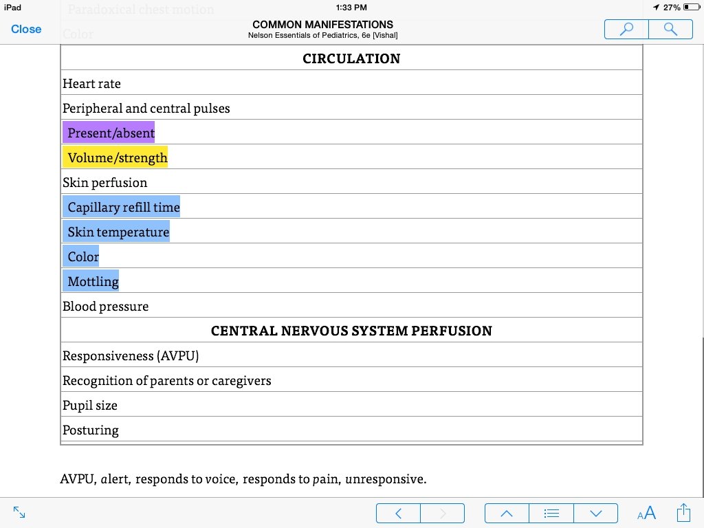 PHYSICAL EXAMINATION Circulatory status is assessed by palpation for distal and central pulses, focusing on the presence and quality of the pulses. Bounding pulses and a wide pulse pressure are often the first sign of the vasodilatory phase of shock and require immediate resuscitation measures. Weak, thready, or absent pulses are indicators for fluid resuscitation, initiation of chest compressions, or both. .