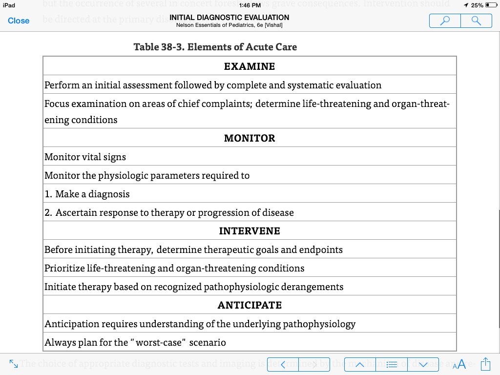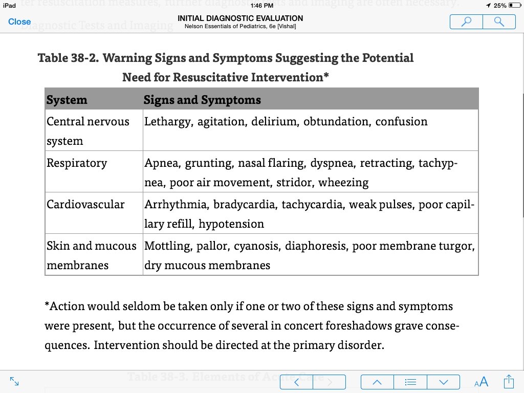 INITIAL DIAGNOSTIC EVALUATION Screening Tests During the initial phase of resuscitation, monitoring vital signs and physiologic status is the key screening activity Continuous monitoring with attention to changes may indicate response to therapy or further deterioration requiring additional intervention. During the initial rapid assessment, diagnostic evaluation often is limited to pulse oximetry and bedside measurement of glucose levels. The latter is important in any child with altered mental status or at risk for inadequate glycogen stores (infants, malnourished patients). After resuscitation measures, further diagnostic tests and imaging are often necessary.