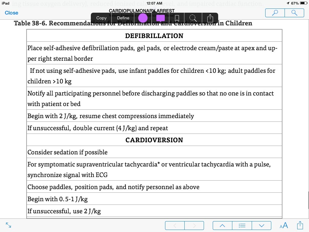 Prompt electrical defibrillation is indicated when ventricular fibrillation or pulseless ventricular tachycardia is noted. CPR should continue until just before defibrillation and resume immediately afterward, minimizing interruptions in compressions. If a second attempt at defibrillation is necessary, it should be followed by a dose of epinephrine. Children failing two episodes of defibrillation may benefit from administration of amiodarone. Defibrillation should be distinguished from cardioversion of supraventricular tachycardias, which also may compromise cardiac output. Cardioversion requires a lower starting dose and synchronization of the discharge to the electrocardiogram to prevent discharging during a susceptible period, which may convert supraventricular tachycardia to ventricular tachycardia or fibrillation.