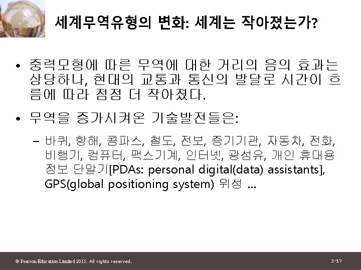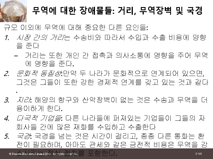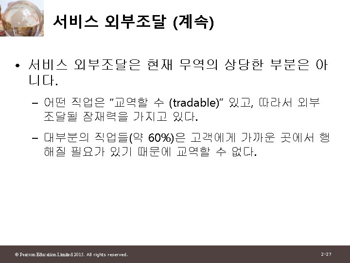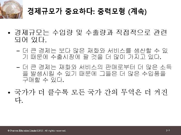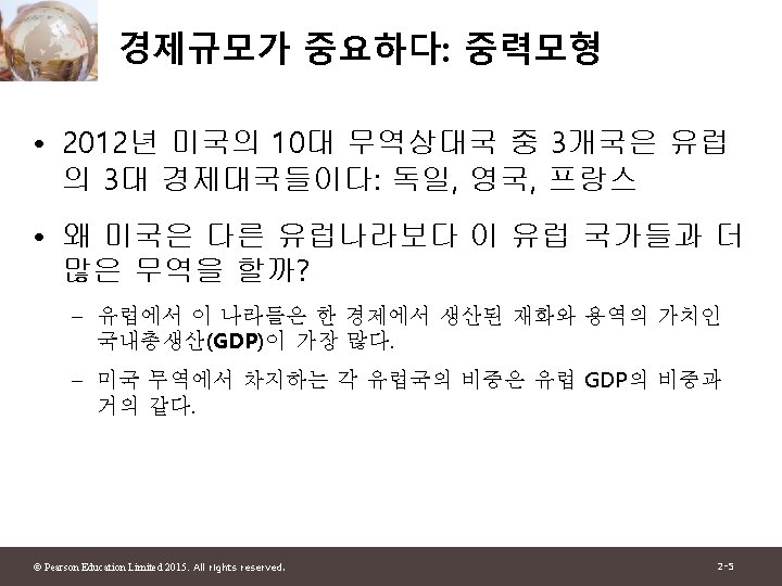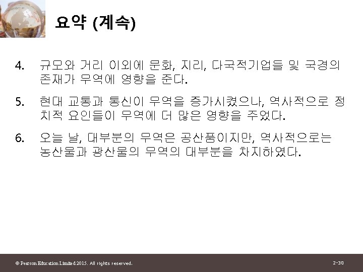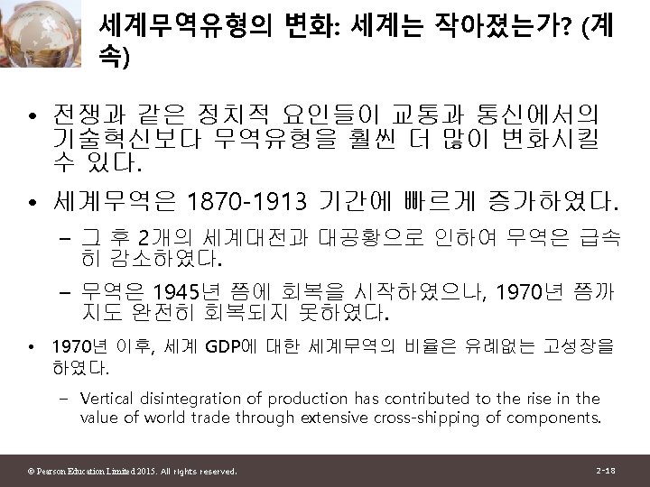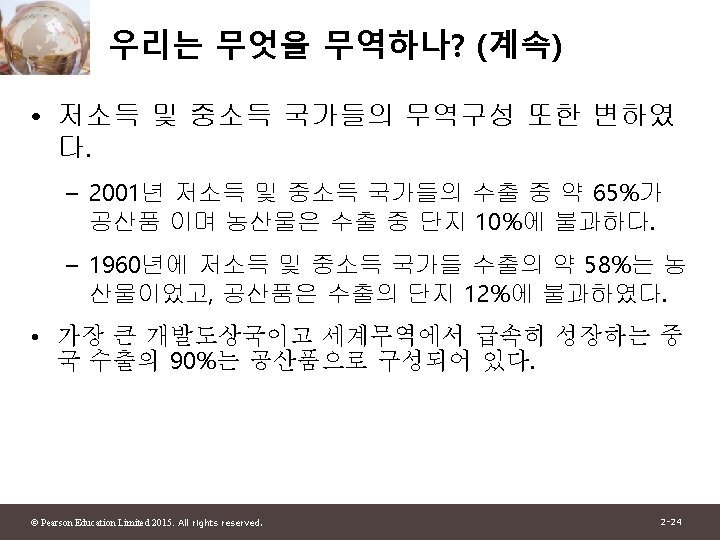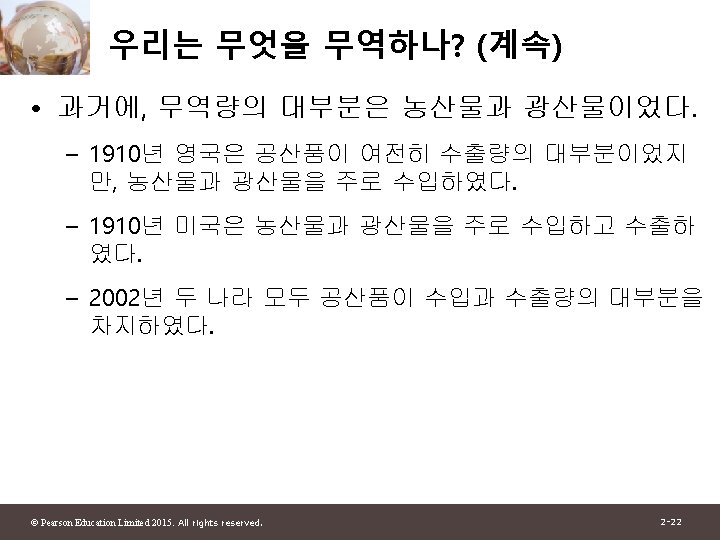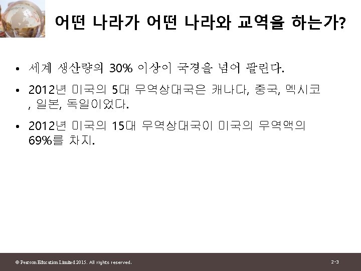 1 2 Pearson Education Limited 2015 All rights Slides: 30 Download presentation 제 1부 국제무역이론 제 2장 세계무역 : 개관 © Pearson Education Limited 2015. All rights reserved. 2 -1 그림 2 -1: 미국과 주요 무역상대국과의 총무역 자료 출처: U. S. Department of Commerce. © Pearson Education Limited 2015. All rights reserved. 2 -4 그림 2 -2: 유럽 각국의 경제 규모와 그들의 미국과의 무역액 자료 출처: U. S. Department of Commerce, European Commission. © Pearson Education Limited 2015. All rights reserved. 2 -6 그림 2 -3: 경제규모와 미국과의 무역 자료 출처: U. S. Department of Commerce, European Commission. © Pearson Education Limited 2015. All rights reserved. 2 -13 그림 2 -4: British Columbia와 교역하는 캐나다의 주 와 미국 주 자료 출처: Statistics Canada, U. S. Department of Commerce. © Pearson Education Limited 2015. All rights reserved. 2 -15 표 2 -1: British Columbia와의 무역의 GDP에 대한 무역비율 (2009) © Pearson Education Limited 2015. All rights reserved. 2 -16 그림 2 -5: 세계무역의 감소와 증가 자료 출처: UN Monthly Bulletin of Statistics, World Trade Organization. © Pearson Education Limited 2015. All rights reserved. 2 -19 그림 2 -6: 그림 2 -5: 세계무역의 구성 (2011) 자료 출처: World Trade Organization. © Pearson Education Limited 2015. All rights reserved. 2 -21 표 2 -2: 상품무역의 공산품 비율 © Pearson Education Limited 2015. All rights reserved. 2 -23 그림 2 -7: 개발도상국 수출의 구성 변화 자료 출처: United Nations Council on Trade and Development. © Pearson Education Limited 2015. All rights reserved. 2 -25 그림 2 -8: 교역할 수 있는 산업의 고용비중 자료 출처: J. Bradford Jensen and Lori. G. Kletzer, “Tradable Services: Understanding the Scope and Impact of Services Outsourcing, ” Peterson Institute of Economics Working Paper 5 -09, May 2005. © Pearson Education Limited 2015. All rights reserved. 2 -28