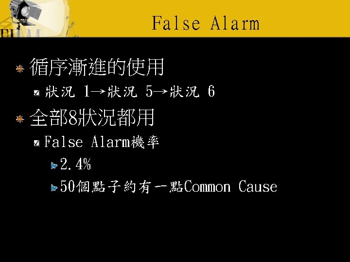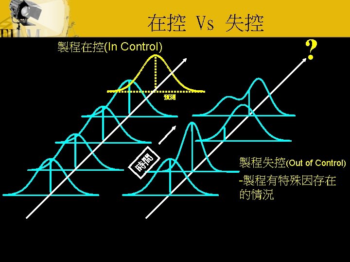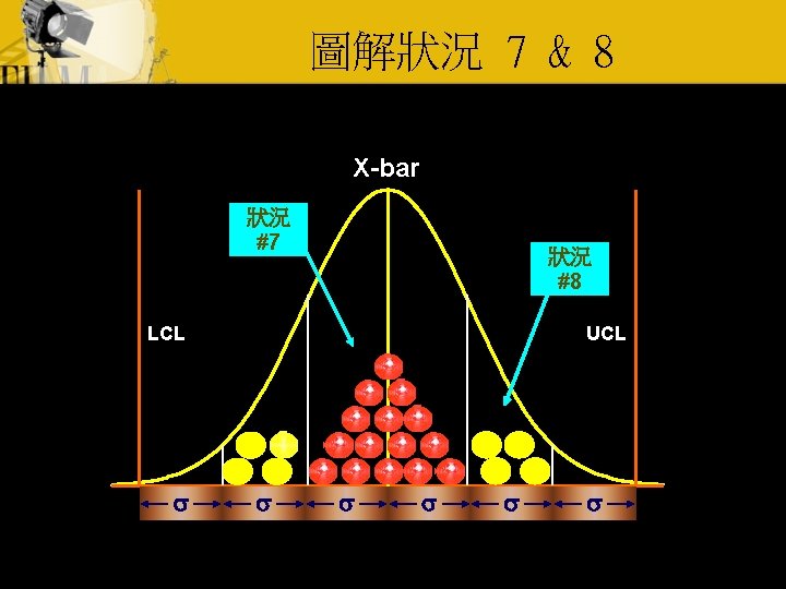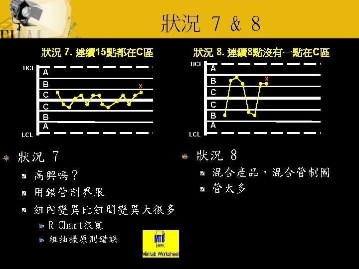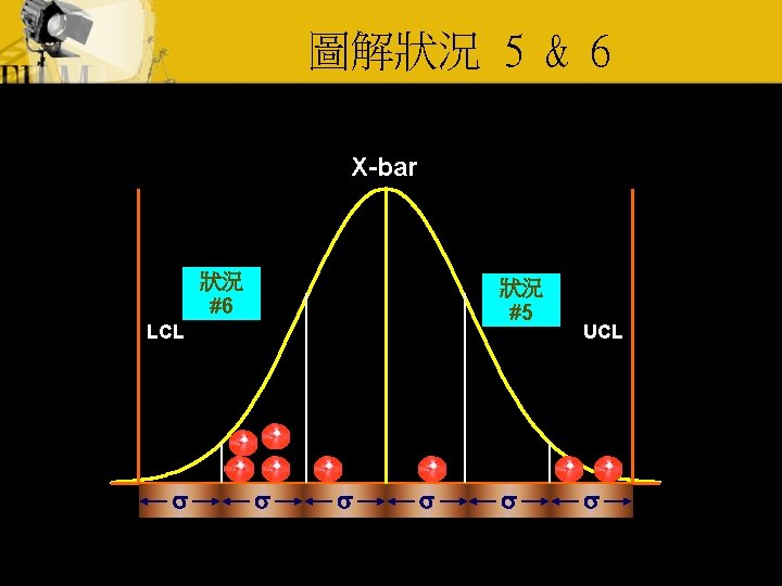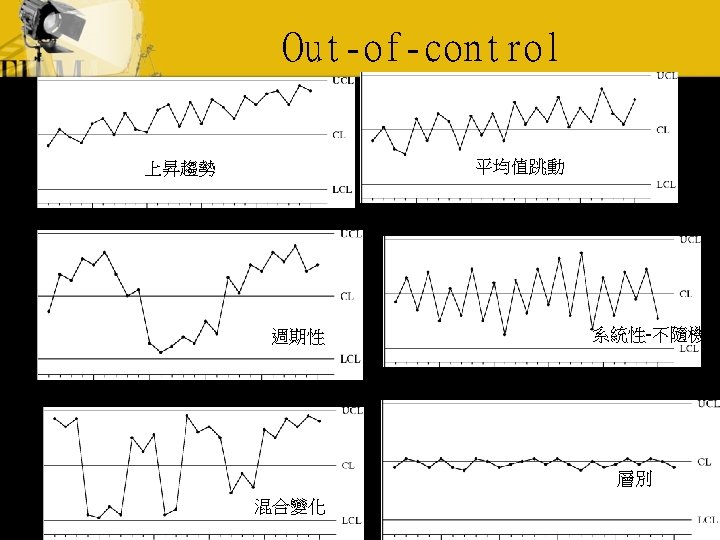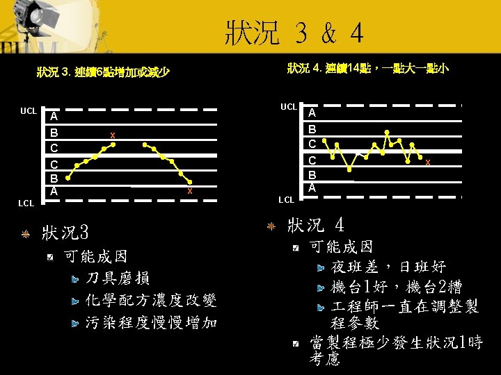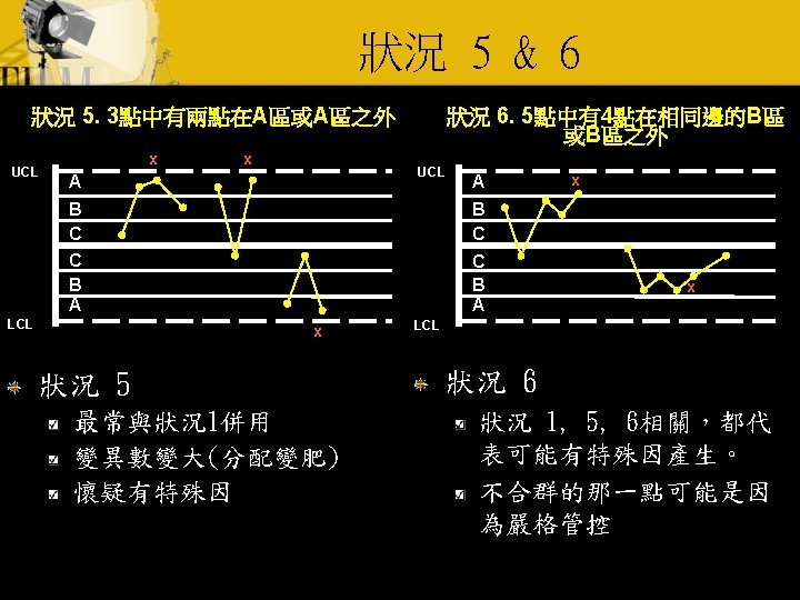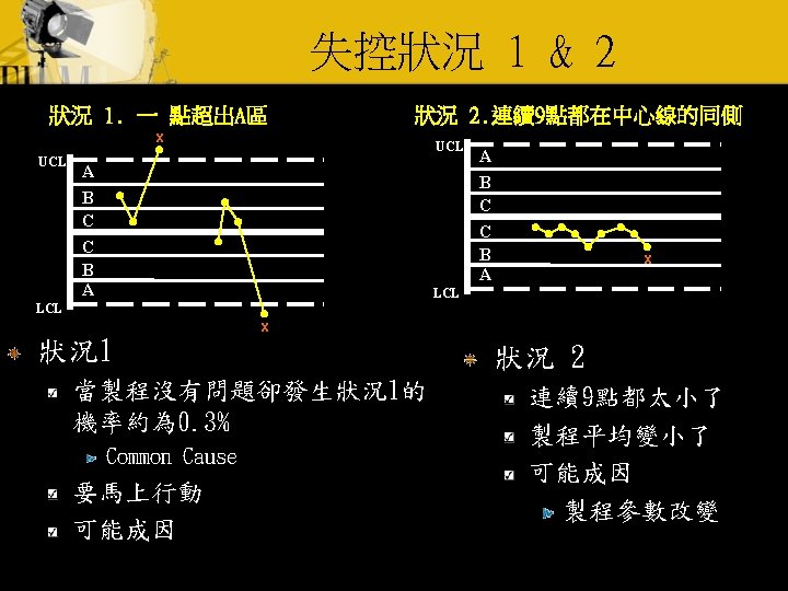 圖解失控狀況1及 2 X-bar LCL 狀況 #2 UCL 狀況 #1 s s Prob(All 9 Xi<Mean)=0. 59=0. 001953 s s Prob(Z>3)=0. 00135