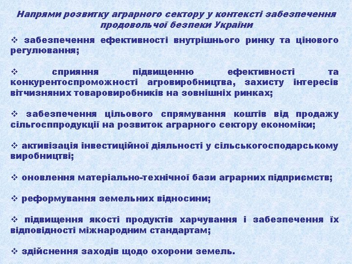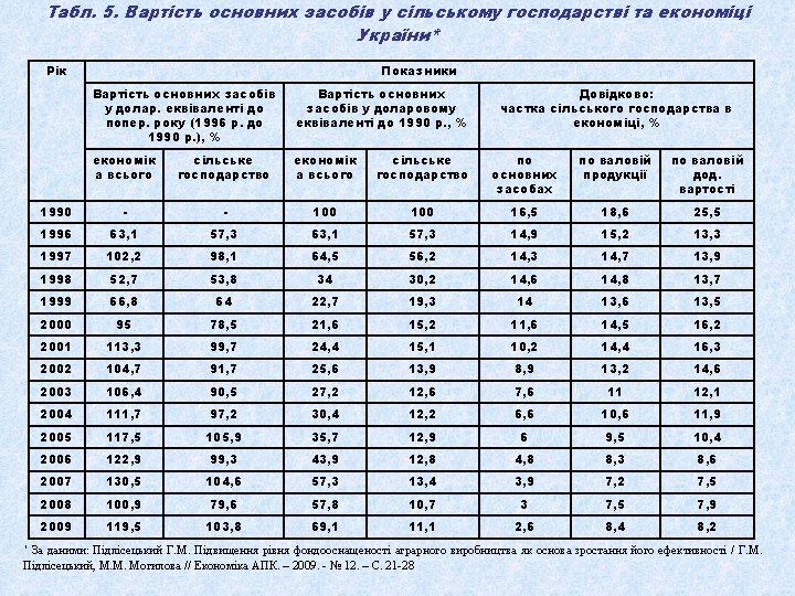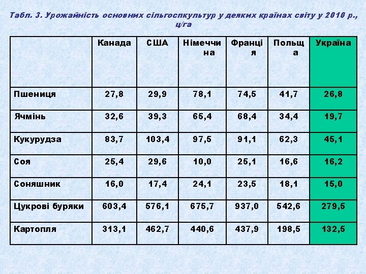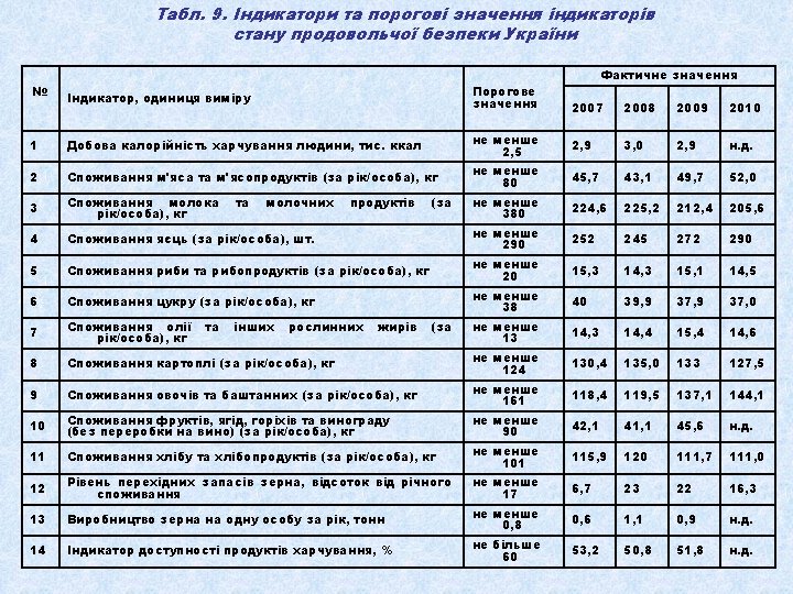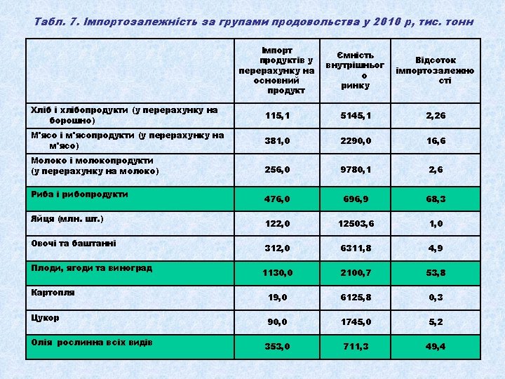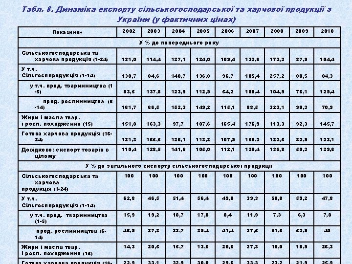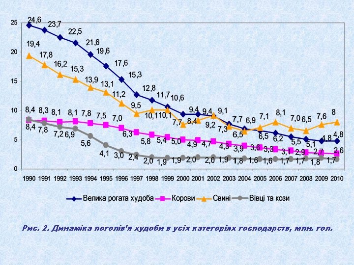 Табл. 1. Динаміка виробництва валової продукції сільського господарства в Україні (у порівнянних цінах 2005 р. ) З неї Валова продукція всього Роки млрд грн. % до 1990 р. 1990 145, 9 1991 % до 1999 р. рослинництва млрд грн. % до 1990 р. 100, 0 66, 6 126, 6 86, 8 1992 116, 1 1993 тваринництва % до 1999 р. млрд грн. % до 1990 р. % до 1999 р. 100, 0 79, 3 100, 0 55, 2 82, 9 71, 4 90, 0 79, 6 55, 9 83, 9 60, 2 75, 9 117, 8 80, 8 62, 3 93, 5 55, 5 70, 0 1994 98, 4 67, 4 47, 7 71, 6 50, 7 63, 9 1995 94, 8 65, 0 49, 4 74, 2 45, 4 57, 3 1996 85, 8 58, 8 45, 0 67, 6 40, 8 51, 5 1997 84, 3 57, 8 48, 2 72, 4 36, 1 45, 5 1998 76, 2 52, 2 39, 5 59, 3 36, 7 46, 3 1999 71, 0 48, 7 100, 0 35, 4 53, 2 100, 0 35, 6 44, 9 100, 0 2000 77, 9 53, 4 109, 7 43, 6 65, 5 123, 2 34, 3 43, 3 96, 3 2001 85, 8 58, 8 120, 8 49, 1 73, 7 138, 7 36, 7 46, 3 103, 1 2002 86, 8 59, 5 122, 3 48, 1 72, 2 135, 9 38, 7 48, 8 108, 7 2003 77, 3 53, 0 108, 9 41, 1 61, 7 116, 1 36, 2 45, 6 101, 7 2004 92, 5 63, 4 130, 3 55, 6 83, 5 157, 1 36, 9 46, 5 103, 7 2005 92, 6 63, 5 130, 4 54, 0 81, 1 152, 5 38, 6 48, 7 108, 4 2006 94, 9 65, 1 133, 7 54, 9 82, 4 155, 1 40 50, 4 112, 4 2007 88, 8 60, 9 125, 1 49, 7 74, 6 140, 4 39, 1 49, 3 109, 8 2008 104, 0 71, 3 146, 5 64, 9 97, 4 183, 3 39, 1 49, 3 109, 8 2009 102, 1 70, 0 143, 8 61, 5 92, 3 173, 7 40, 5 51, 1 113, 8 2010 100, 5 68, 9 141, 6 58, 7 88, 2 165, 8 41, 9 52, 8 117, 7