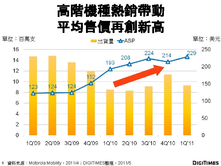 摩托羅拉行動營收攀升 單位:百萬美元 1 註:摩托羅拉於 2011年第 1季起分割為Motorola Mobility與Motorola Solutions。Motorola Mobility 包含行動裝置與家用連網解決方案業務。 資料來源:Motorola Mobility,2011/4;DIGITIMES整理,2011/5